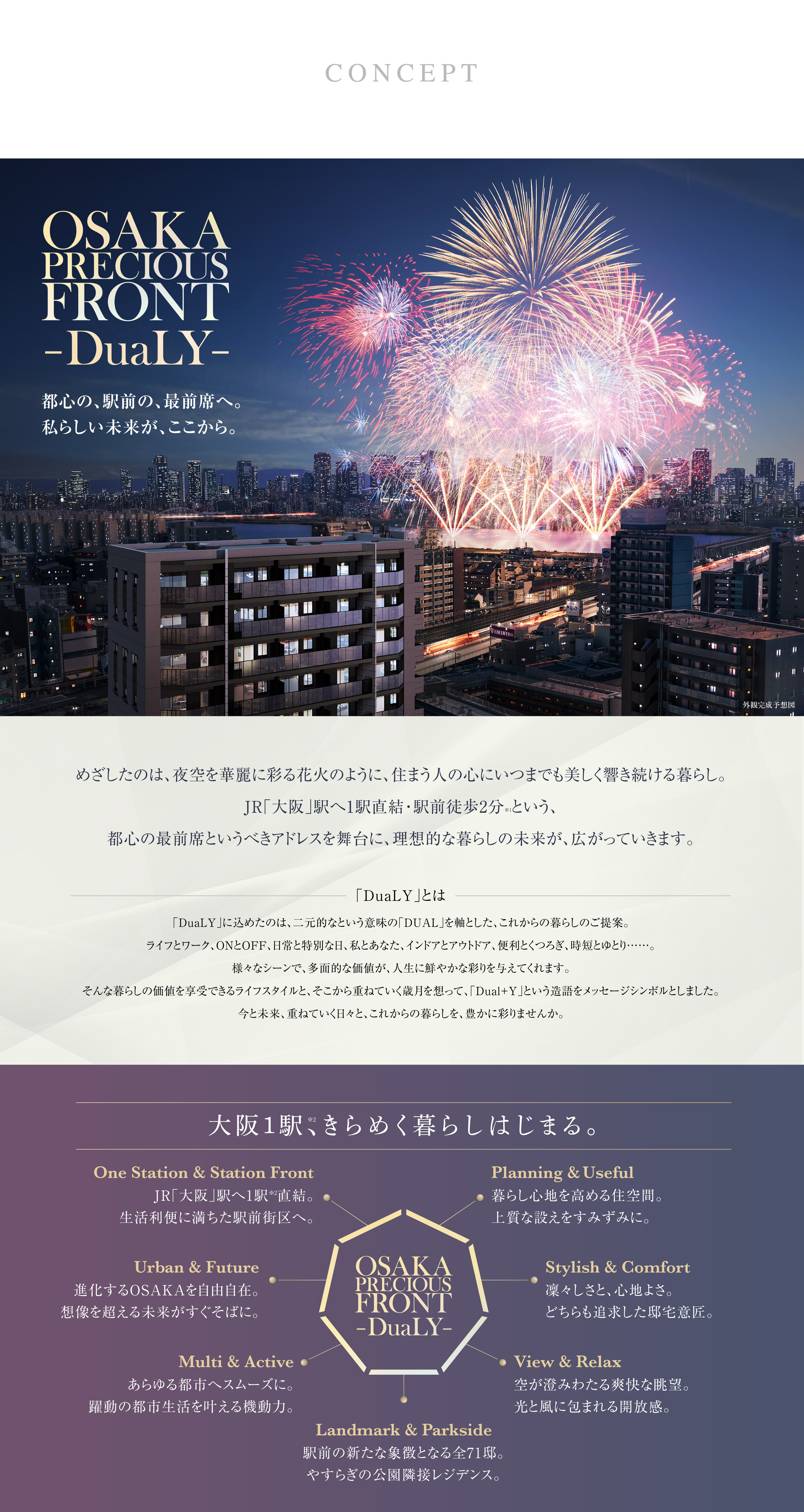 ※掲載の完成予想図は、図面を基に描き起こしたもので、官公庁の指導、施工上の都合等により、建物の形状・色調等、実際とは異なります。 また、エアコン室外機・給湯器・TVアンテナ等再現されていない設備機器等がございます。また、「なにわ淀川花火大会」の花火CGを合成しており、花火の打ち上げ位置、大きさ、高さについては実際とは異なります。「なにわ淀川花火大会」は、 社会情勢の事情により中止や延期等になる場合がございます。