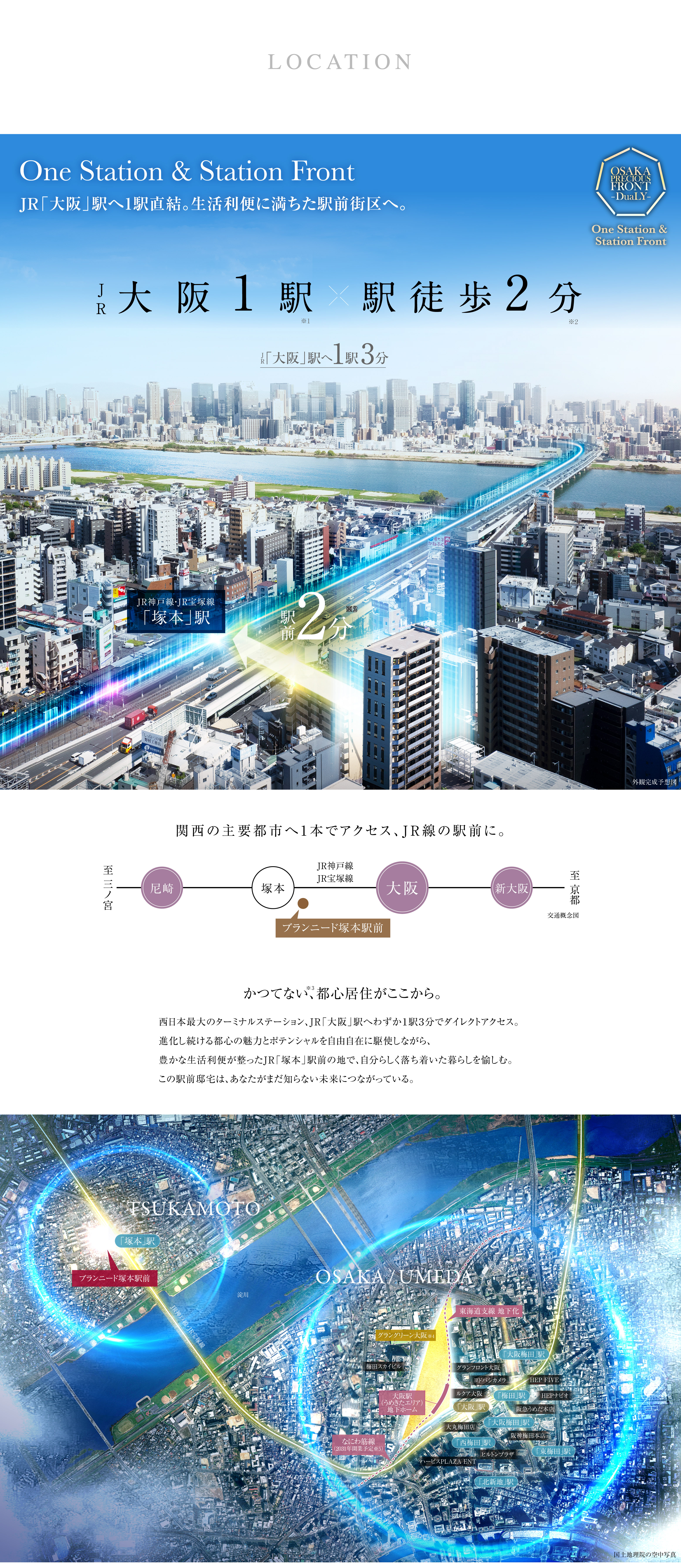 ※2 JR神戸線「塚本」駅まで、現地サブエントランスより徒歩2分(約120m/西口まで)、現地メインエントランスより徒歩3分(約190m/西口まで)。