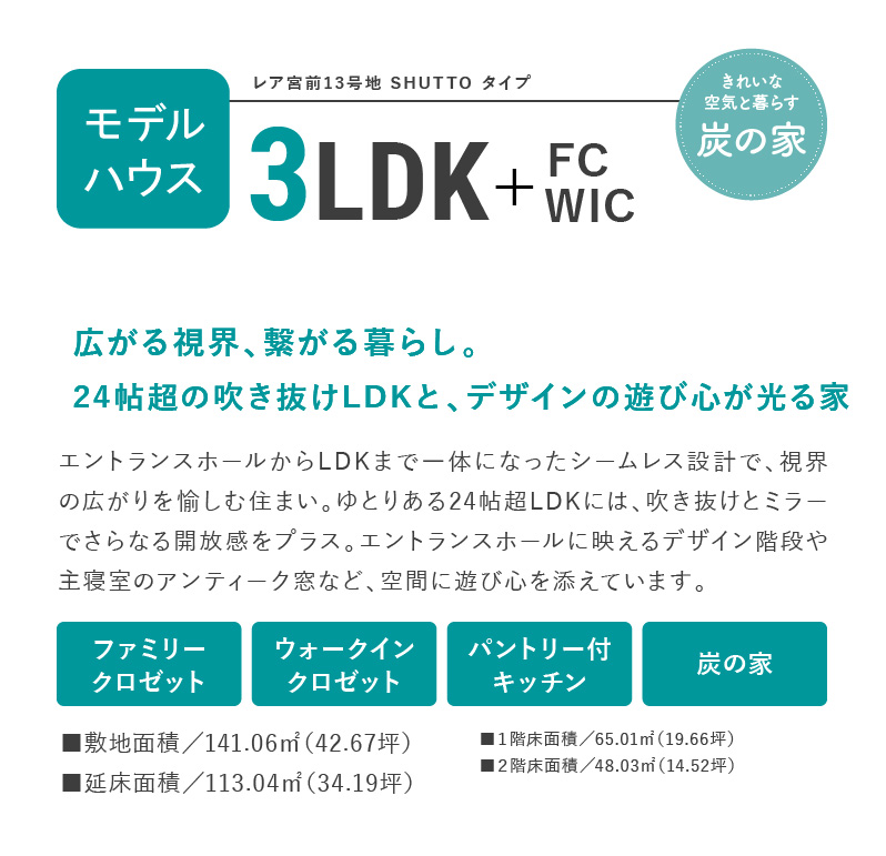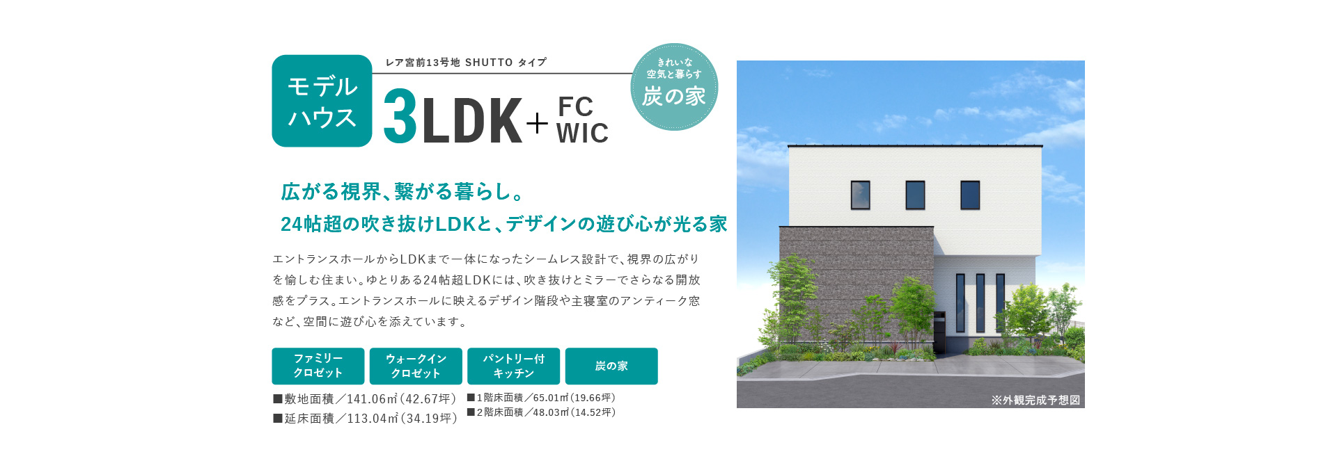 ※掲載の外観・内観写真は2026年2月に現地モデルハウスにて撮影されたもので、一部CG加工を施しております。※FC=ファミリークロゼット、WIC=ウォークインクロゼット。