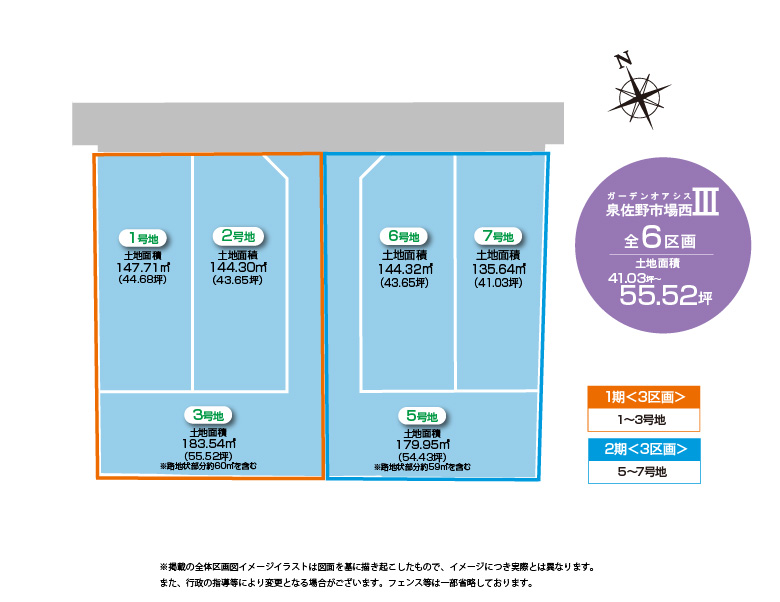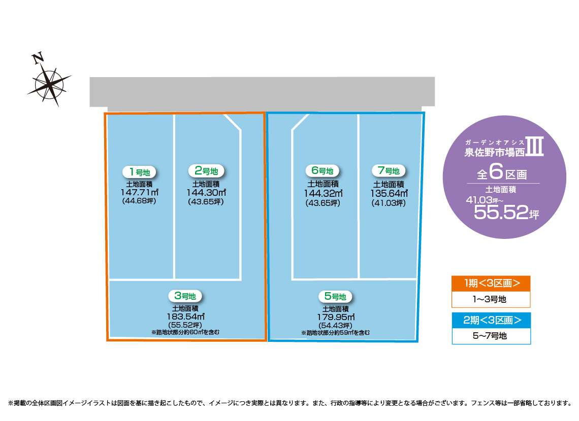 総区画数 6 区画 (1期:3区画、2期:3区画) 用途地域 準工業地域 地目 宅地 建ペイ率 60% 容積率 200% 電気・ガス 関西電力・都市ガス 水道・排水 公営水道・公共下水道なし(別途、個別浄化槽が必要になります。) 私道負担 無し 道路幅員 4.21m(北東側市道) 開発面積 956.68㎡(1期:496.76㎡)、2期:459.92㎡) 開発許可番号 (小規模団地につき開発許可番号無し) 造成完了時期 2025年1月(1期)、2026年1月(2期) 宅地面積 135.64m2(41.03坪)~183.54m2(55.52坪)※路地状部分約60m2を含む その他 宅地造成及び特定盛土等規制法、泉佐野市景観計画 売主 フジ住宅株式会社