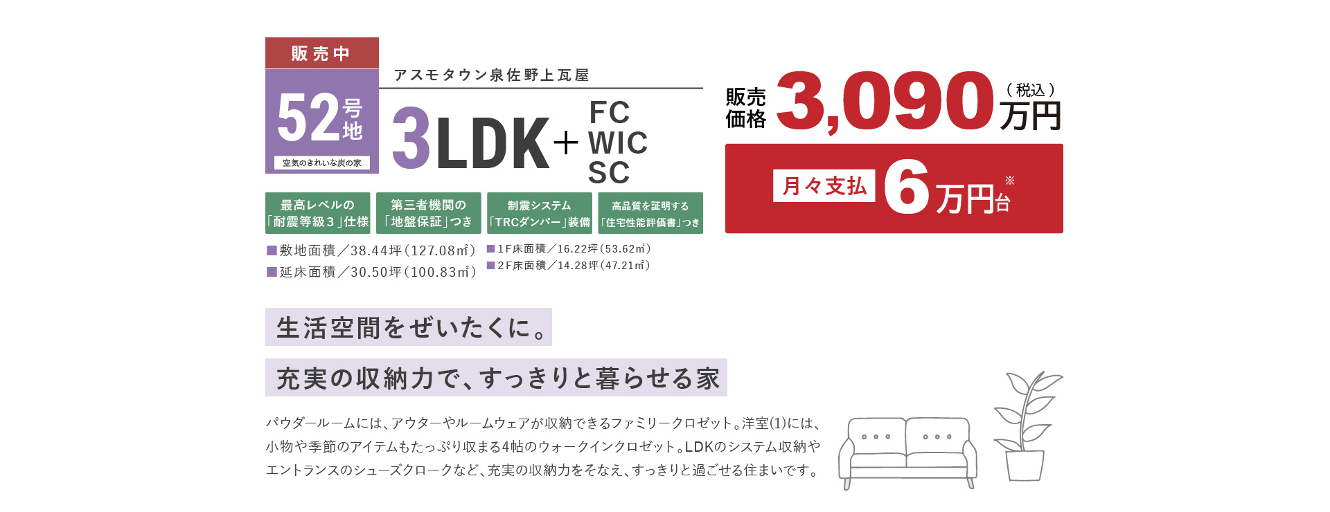 区画名称 アスモタウン泉佐野上瓦屋 52号地・82号地 販売戸数 2 戸 販売価格 52号地:3,090万円(税込)82号地:2,890万円(税込) 外構・付帯工事費 販売価格に含む 間取り 52号地:3LDK+FC+WIC+SC82号地:3LDK+WIC+SC 建物面積 52号地:100.83m2(30.50坪)82号地:96.27m2(29.12坪) 土地面積 52号地:127.08m2(38.44坪)82号地:110.94m2(33.55坪) 完成時期(築年月) 52号地:2026年2月82号地:2026年1月 建築確認番号 52号地:第R07確認建築近確0001180号(2025年8月1日)82号地:第R07確認建築近確0001182号(2025年8月4日) 販売スケジュール 先着順 入居時期 2026年6月以降 構造・規模 木造(在来軸組工法) 取引条件の有効期限 2025年11月11日 売主 フジ住宅株式会社 問い合わせ 0120-24-0413 ※諸費用/自治会費、登記費用、並びに住宅ローンご利用の方は利用するローンの規定と利用形態に応じた保証料・事務手数料及び火災保険料等が必要になります。 ※先着順につき、契約済の場合がございます。あらかじめご了承ください。 ※販売価格には、消費税(10%)相当額が含まれます。