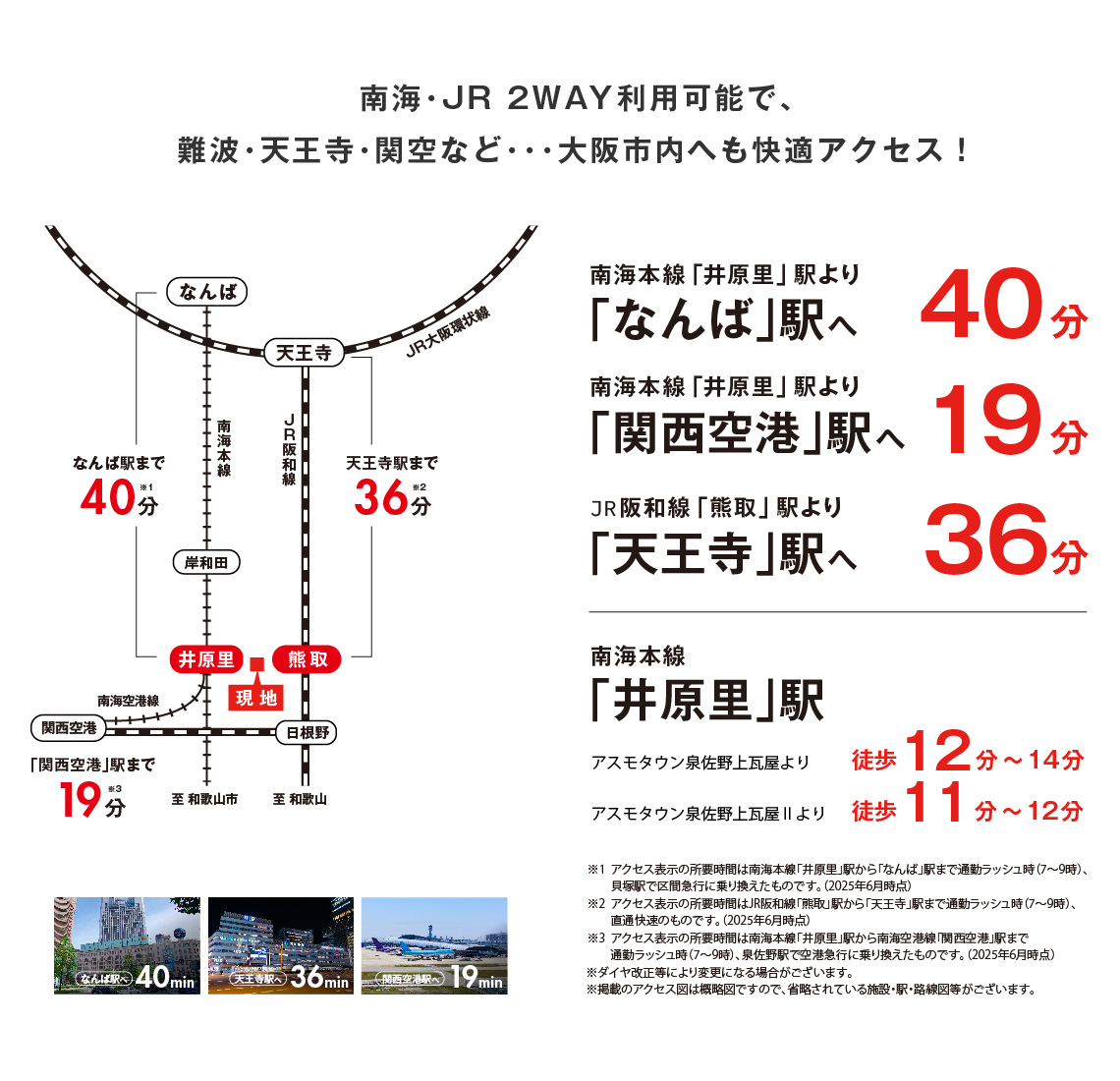 アスモタウン泉佐野上瓦屋:JR阪和線「熊取」駅まで徒歩15分~18分、アスモタウン泉佐野上瓦屋Ⅱ:JR阪和線「熊取」駅まで徒歩17分~18分