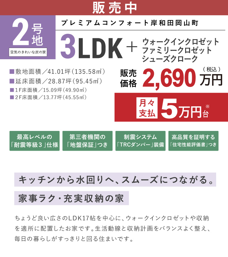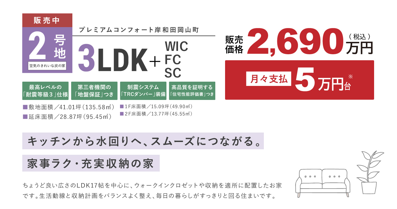 区画名称 プレミアムコンフォート岸和田岡山町2号地 販売戸数 1 戸 販売価格 2,690万円(税込) 外構・付帯工事費 販売価格に含む 間取り 3LDK+FC+WIC+SC 建物面積 95.45m2(28.87坪) 土地面積 135.58m2(41.01坪)※他に私道40.12m2有 建築確認番号 第R07確認建築近確0002859号(2026年1月13日) 完成時期(築年月) 2026年6月 入居時期 2026年10月以降 構造・規模 木造(在来軸組工法) 販売スケジュール 先着順 取引条件の有効期限 2026年2月3日 売主 フジ住宅株式会社 問い合わせ 0120-24-0413 ※諸費用/自治会費、登記費用、並びに住宅ローンご利用の方は利用するローンの規定と利用形態に応じた保証料・事務手数料及び火災保険料等が必要になります。 ※先着順につき、契約済の場合がございます。あらかじめご了承ください。 ※販売価格には、消費税(10%)相当額が含まれます。