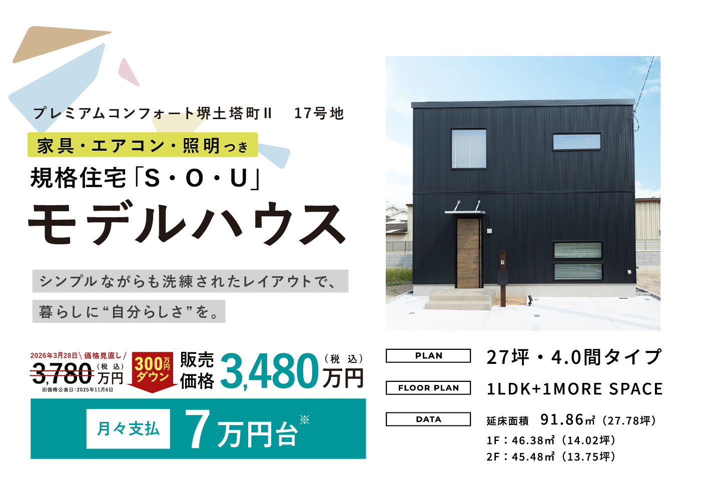 - NEW 【プレミアムコンフォート堺土塔町Ⅱ17号地】300万円プライスダウン!家具・照明・エアコン付きモデルハウス特別分譲中!
