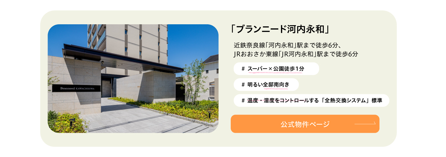 近鉄奈良線「河内永和」駅まで徒歩6分、JRおおさか東線「JR河内永和」駅まで徒歩6分と、2路線が利用できる利便性の高い立地。スーパーと公園が徒歩1分にあり、日常生活のしやすさが魅力です。全邸南向きの明るい住まいに加え、温度・湿度をコントロールする「全熱交換システム」を標準装備。家族の健康と快適さを守る、住まいがここにあります。