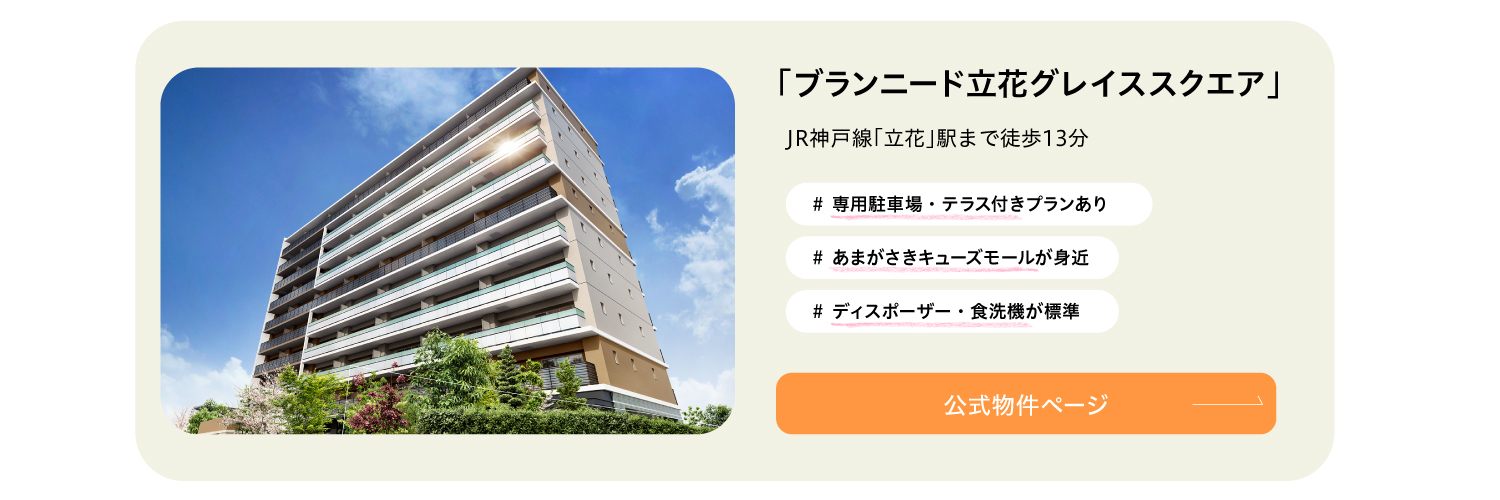 JR神戸線「立花」駅まで徒歩13分。通勤・通学に便利な立地にありながら、暮らしの快適さも大切にしたマンションです。専用庭やテラス付きプランがあり、家族でガーデニングやアウトドア気分を楽しむことができます。さらに、大型商業施設「あまがさきキューズモール」が身近にあり、買い物の利便性も抜群。ディスポーザーや食洗機といった設備が整い、日々の暮らしをスマートにサポートしてくれます。