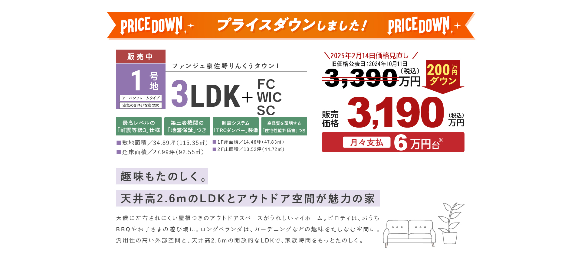 区画名称 ファンジュ泉佐野りんくうタウンⅠ3号地 販売戸数 1 戸 販売価格 2,980万円 外構・付帯工事費 販売価格に含む 間取り 3LDK+FC+WIC+SC 建物面積 92.75m2(28.05坪) 土地面積 104.59m2(31.63坪) 完成時期(築年月) 2025年11月 建築確認番号 第トラスト25-0746号(2025年7月15日) 販売スケジュール 先着順 入居時期 契約後3ヶ月 構造・規模 木造(在来軸組工法) 取引条件の有効期限 2025年12月16日 売主 フジ住宅株式会社 問い合わせ 0120-24-0413 ※諸費用/自治会費、登記費用、並びに住宅ローンご利用の方は利用するローンの規定と利用形態に応じた保証料・事務手数料及び火災保険料等が必要になります。 ※先着順につき、契約済の場合がございます。あらかじめご了承ください。 ※販売価格には、消費税(10%)相当額が含まれます。