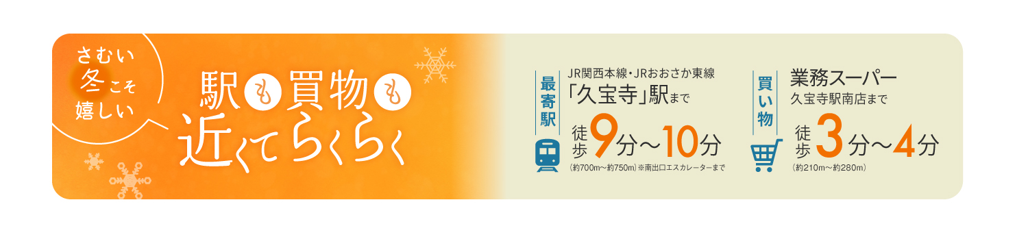 JR関西本線「久宝寺」駅 (南出口エスカレーター)まで ・・・ 徒歩9分~10分(約700m~750m) JR関西本線「八尾」駅 (南口)まで ・・・ 徒歩10分(約740m~800m) 近鉄大阪線「久宝寺口」駅 (東口)まで ・・・ 自転車7分~8分(約2,070m~2,120m) 近鉄大阪線「近鉄八尾」駅(中央南口1F)まで ・・・ 自転車9分(約2,450m~2,500m)