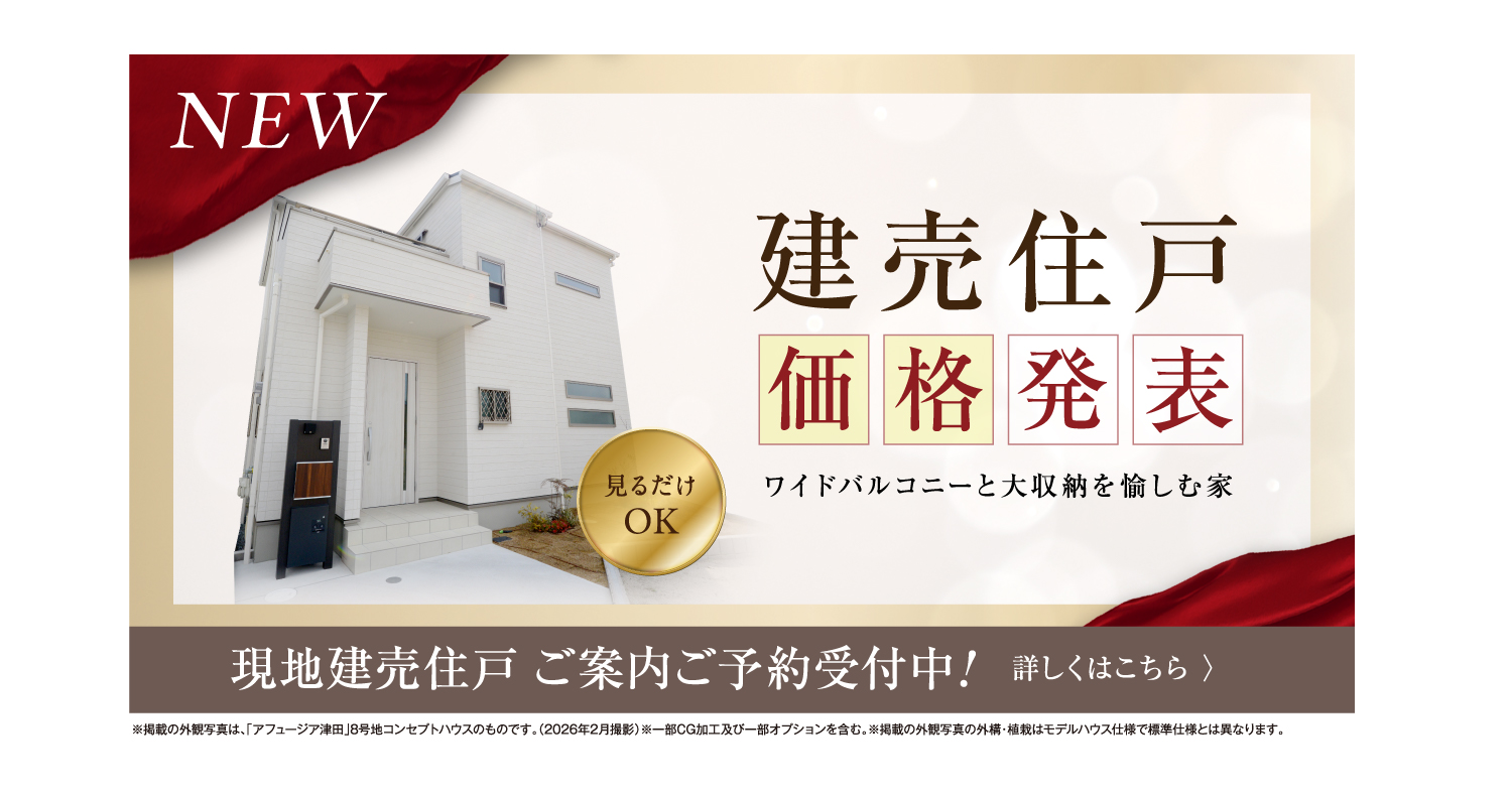 ※掲載の外観写真は「アフュージア津田」7号地モデルハウス、8号地コンセプトハウスのものです。(2026年2月撮影)※一部CG加工及び一部オプションを含む