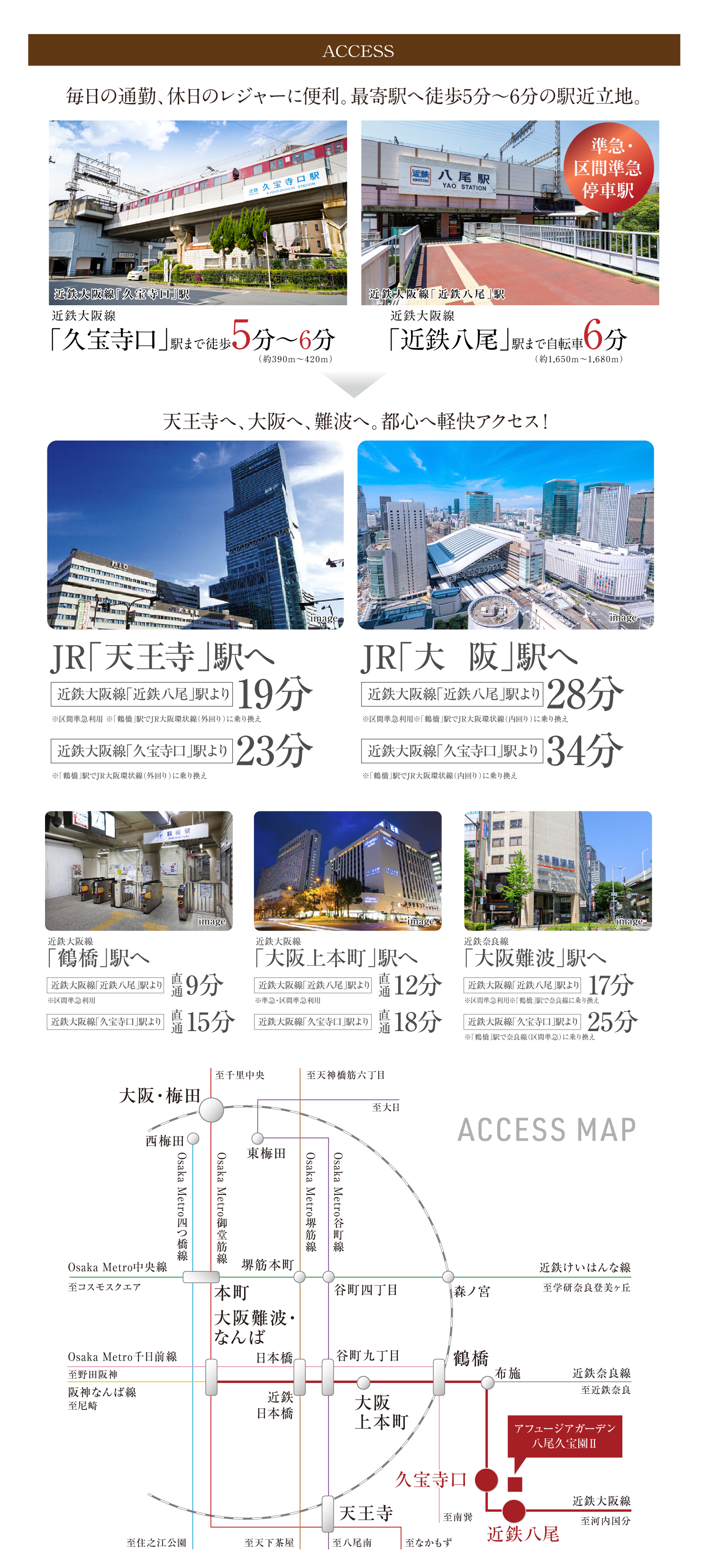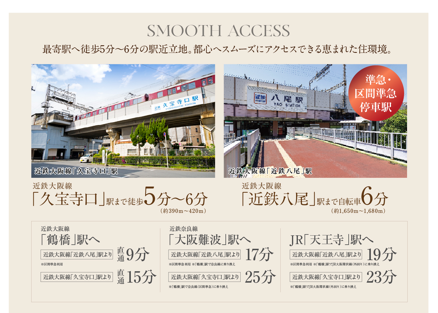 近鉄大阪線「久宝寺口」駅まで 徒歩5分~徒歩6分(約390m~約420m) 近鉄大阪線「弥刀」駅まで 徒歩10分~徒歩11分(約800m~約830m) 近鉄大阪線「近鉄八尾」駅まで 自転車6分(約1650m~約1680m) JR関西本線・おおさか東線「久宝寺」駅まで 自転車7分(約1980m~約2010m)