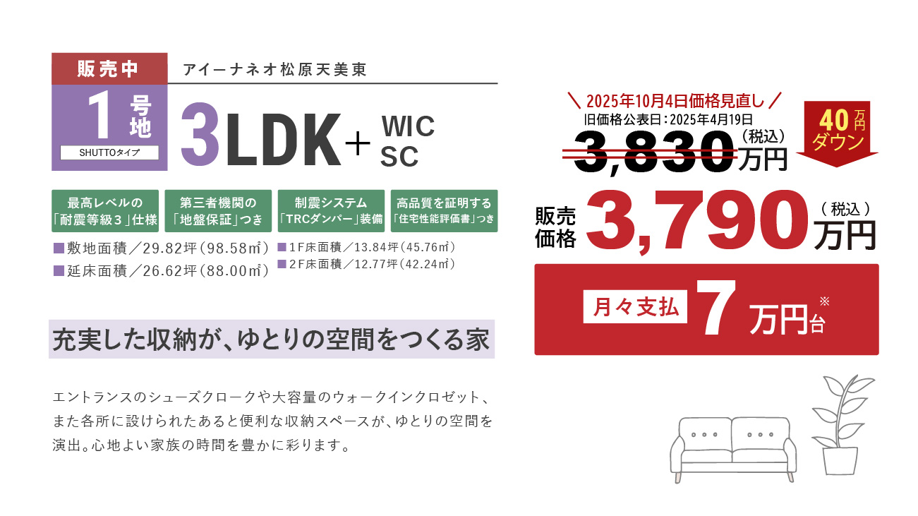 ※40年返済での計算です。※当社提携銀行ローン0.87%/3,790万円の物件を頭金0円で3,790万円借入れの場合※月々返済/76,988円※ボーナス返済(年2回)/10.0万円(1回分) ※当社提携銀行ローン 年0.87%(変動金利)※元利均等払い・変動金利(現行金利3.075%から-2.205%優遇金利を適用した場合の計算例です。)※金利は変更される場合があります。上記金利は2025年10月1日現在のものです。上記金利は一定の条件を満たす方の例です。※融資限度額/購入価格が融資限度額(100万円以上2億円以内・10万円単位)※融資限度額の割合/物件価格の最高110%以内(各金融機関による)※銀行融資手数料/お借入金額 ×~2.2%(各金融機関による)※金融機関事務手数料/66,000円(各金融機関による)※団体信用生命保険/加入要※当社事務手数料/110,000円(税込)※価格には、消費税(10%)相当額が含まれます。※販売価格には外構・付帯工事費が含まれます。※諸費用/自治会費、登記費用、並びに住宅ローンご利用の方は利用するローンの規定と利用形態に応じた保証料・事務手数料及び火災保険料等が必要になります。※間取図・外構等は図面をもとに描いたイメージにつき、実際とは一部異なる場合があります。※家具・車の表記はイメージ配置になり、実際には付きません。(2025年3月時点)※掲載の外観・内観写真は2025年7月に撮影したものです。