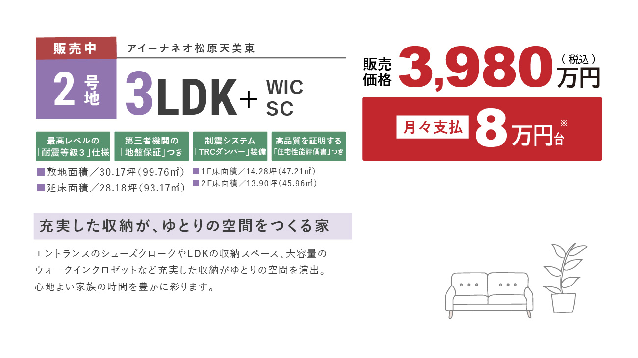 ※40年返済での計算です。※当社提携銀行ローン0.87%/3,980万円の物件を頭金0円で3,980万円借入れの場合※月々返済/81,677円※ボーナス返済(年2回)/10万円(1回分) ※当社提携銀行ローン 年0.87%(変動金利)※元利均等払い・変動金利(現行金利3.075%から-2.205%優遇金利を適用した場合の計算例です。)※金利は変更される場合があります。上記金利は2025年10月1日現在のものです。上記金利は一定の条件を満たす方の例です。※融資限度額/購入価格が融資限度額(100万円以上2億円以内・10万円単位)※融資限度額の割合/物件価格の最高110%以内(各金融機関による)※銀行融資手数料/お借入金額 ×~2.2%(各金融機関による)※金融機関事務手数料/66,000円(各金融機関による)※団体信用生命保険/加入要※当社事務手数料/110,000円(税込)※価格には、消費税(10%)相当額が含まれます。※販売価格には外構・付帯工事費が含まれます。※諸費用/自治会費、登記費用、並びに住宅ローンご利用の方は利用するローンの規定と利用形態に応じた保証料・事務手数料及び火災保険料等が必要になります。※間取図・外構等は図面を基に描いたイメージにつき、実際とは一部異なる場合があります。(2025年3月時点) ※間取図の家具・車の表記はイメージ配置になり、実際には付きません。詳しくは係員にお問い合わせください。※掲載の外観・内観写真は2025年5月に撮影したものです。