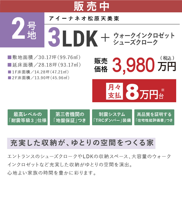 2号地:99.76m2(30.17坪) ※土地面積には隣地越境による建確申請外面積0.84m2を含む建築確認番号 1号地:第R06確認建築近確0002483号(2024年12月11日)、2号地:第R06確認建築近確0002484号(2024年12月11日) 販売スケジュール 先着順 入居時期 契約後3ヶ月 構造・規模 木造 2階建 完成時期(築年月) 1号地:2025年6月、2号地:2025年5月 取引条件の有効期限 2026年3月3日 売主 フジ住宅株式会社 問い合わせ 0120-24-0413 ※諸費用/自治会費、登記費用、並びに住宅ローンご利用の方は利用するローンの規定と利用形態に応じた保証料・事務手数料及び火災保険料等が必要になります。 ※先着順につき、契約済の場合がございます。あらかじめご了承ください。 ※契約・手続きの状況によってはご希望の時期にご入居出来ない場合もございますので事前に担当者にご確認ください。