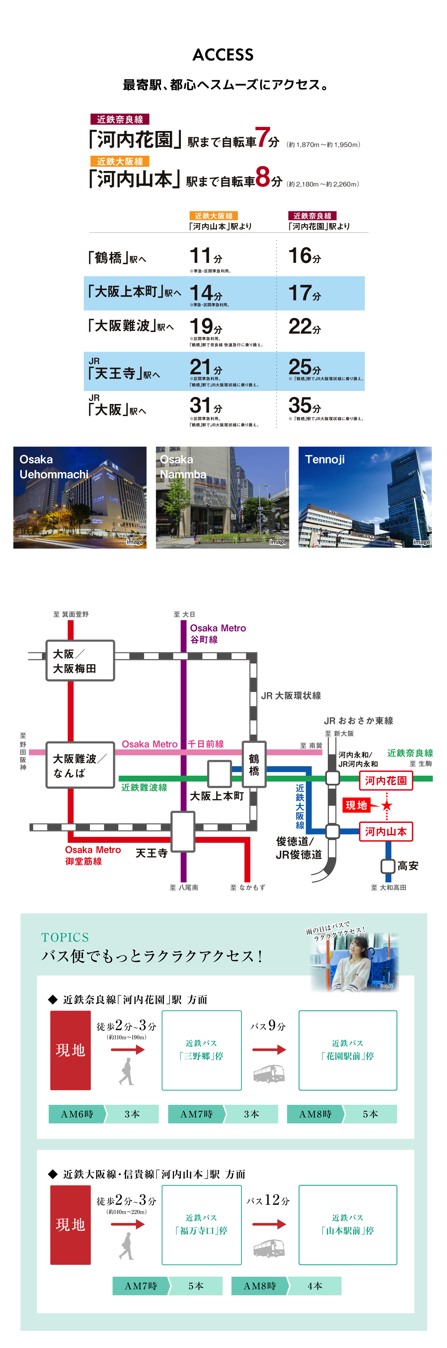 近鉄奈良線「河内花園」駅まで徒歩24分~25分(約1,870m~約1,950m)※南出口まで 近鉄大阪線・信貴線「河内山本」駅まで徒歩28分~29分(約2,180m~約2,260m)※北出口まで 近鉄奈良線「東花園」駅まで徒歩32分~33分(約2,500m~約2,580m)※南出口まで 近鉄バス「三野郷」停まで徒歩2分~3分(約110m~約190m)※北行き 近鉄バス「三野郷」停まで徒歩3分~4分(約180m~約260m)※南行き 近鉄バス「福万寺口」停まで徒歩2分~3分(約140m~約220m)※南行き 近鉄バス「福万寺口」停まで徒歩2分~4分(約160m~約250m)※北行き 近鉄バス「高砂住宅」停まで徒歩3分~4分(約190m~約270m) 近鉄大阪線「近鉄八尾」駅まで徒歩38分~39分(約3,000m~約3,090m)※中央北口まで