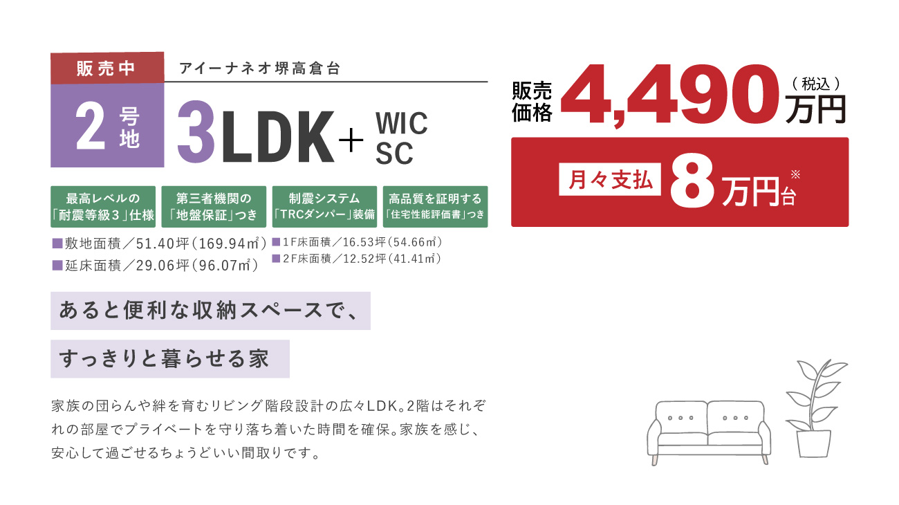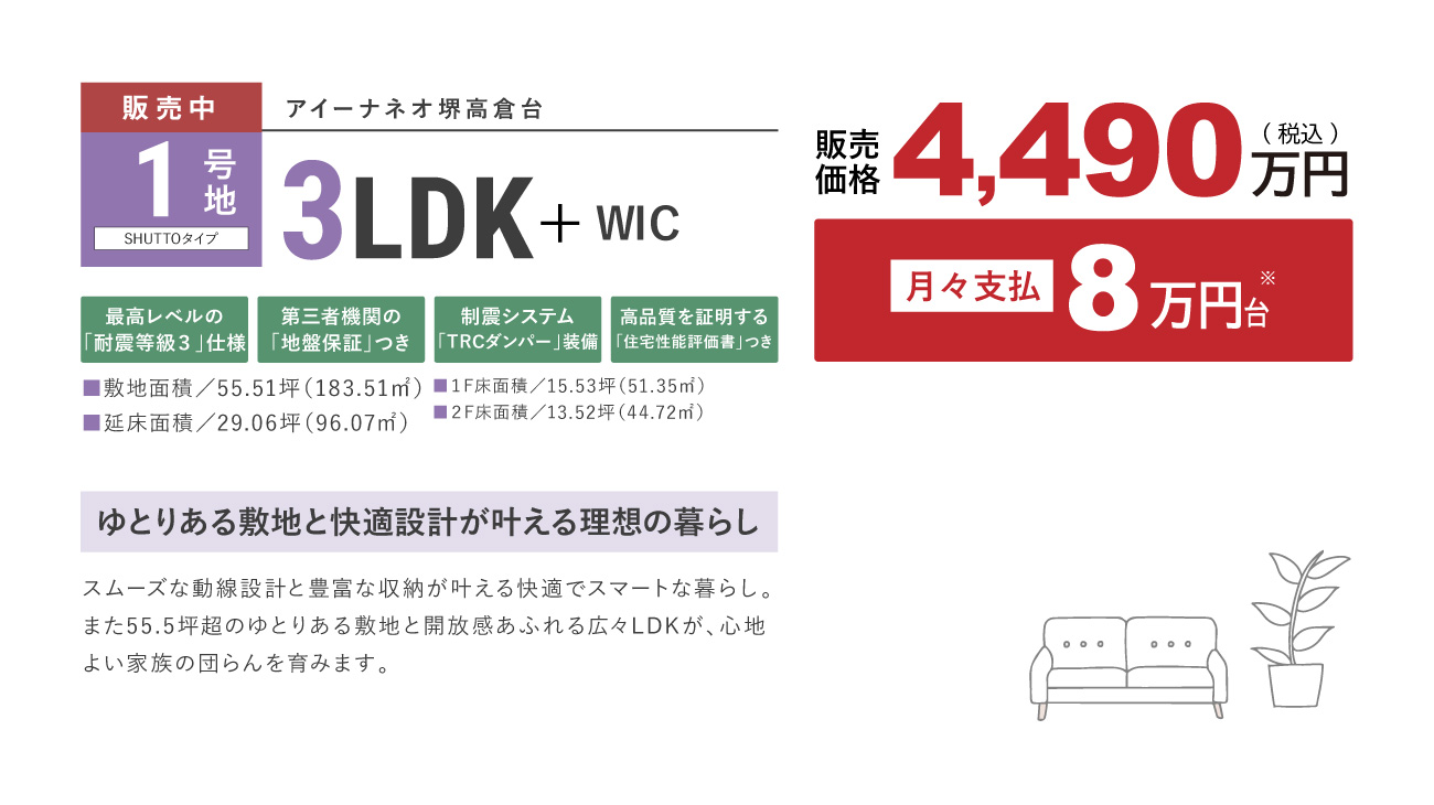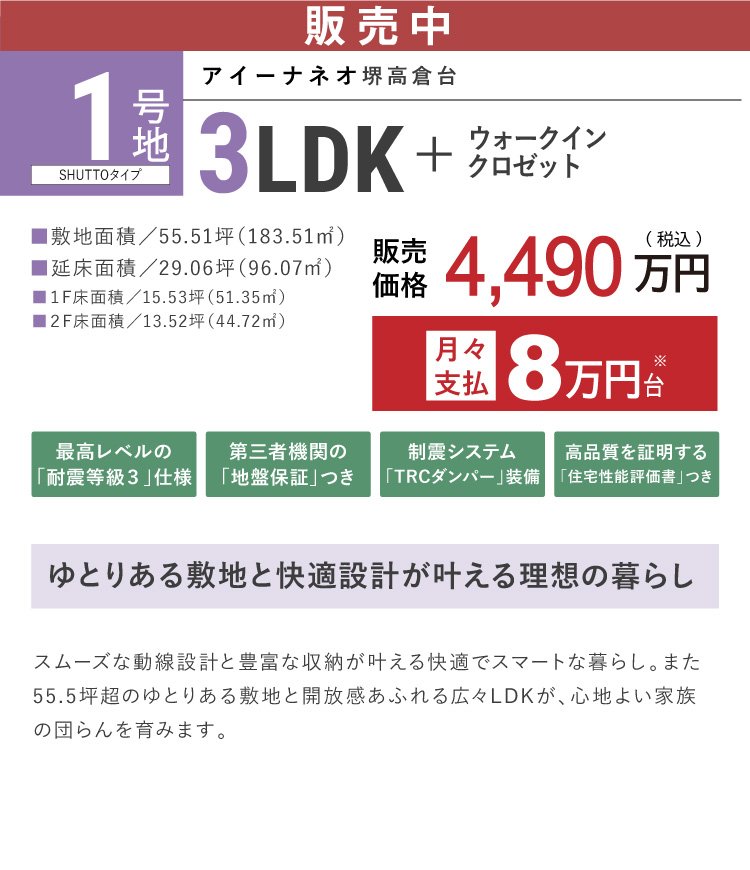 区画名称 アイーナネオ堺高倉台 販売戸数 2 戸 販売価格 4,490万円 最多価格帯 販売価格に含む 間取り 1号地:3LDK+WIC2号地:3LDK+WIC+SC 建物面積 1号地:96.07m2(29.06坪)2号地:96.07m2(29.06坪) 土地面積 1号地:183.51m2(55.51坪)2号地:169.94m2(51.40坪)※土地面積には道路集水桝越境によ る建確申請外面積0.16m2を含む 建物竣工時期 2026年2月 建築確認番号 1号地:R07確認建築近確0001393号(2025年8月20日)2号地:R07確認建築近確0001394号(2025年8月20日) 販売スケジュール 先着順 入居時期 完成後3ヶ月 構造・規模 木造2階建て 取引条件の有効期限 2025年11月25日 売主 フジ住宅株式会社 問い合わせ 0120-24-0413 ※シンボルツリーにつきましては、お引渡し後に当社指定業者と打ち合わせをしていただき、植栽箇所を決めていただきます。ご契約者様のご要望によりシンボルツリーを設けない区画が生じることがあります。尚、シンボルツリーをご希望されない場合でも、返金等には応じかねますのでご了承ください。 ※諸費用/自治会費、登記費用、並びに住宅ローンご利用の方は利用するローンの規定と利用形態に応じた保証料・事務手数料及び火災保険料等が必要になります。 ※先着順につき、契約済の場合がございます。あらかじめご了承ください。 ※販売価格には、消費税(10%)相当額が含まれます。
