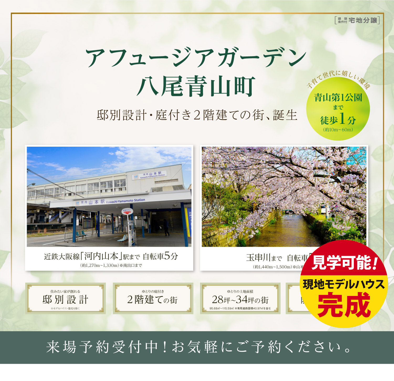 (公社)近畿地区不動産公正取引協議会加盟問い合わせ 0120-00-0022 ※自由設計について、当社の定める構造及び仕様の範囲内で自由に設計できますが、一部お客様のご要望にお応え出来ない場合がありますので、あらかじめご了承ください。 ※この土地は土地売買契約後3ヶ月以内に当社と建築請負契約をむすんで頂くことを停止条件として販売します。この期間内に建築請負契約が成立しない場合は、売買契約はなかったことになり申し込み金その他お預かりした金員は全額無条件にて返還します。 ※シンボルツリーにつきましては、お引渡し後に当社指定業者と打ち合わせをしていただき、植栽箇所を決めていただきます。ご契約者様のご要望によりシンボルツリーを設けない区画が生じることがあります。尚、シンボルツリーをご希望されない場合でも、返金等には応じかねますのでご了承ください。 ※諸費用/自治会費、登記費用、並びに住宅ローンご利用の方は利用するローンの規定と利用形態に応じた保証料・事務手数料及び火災保険料等が必要になります。 ※先着順につき、契約済の場合がございます。あらかじめご了承ください。情報更新日