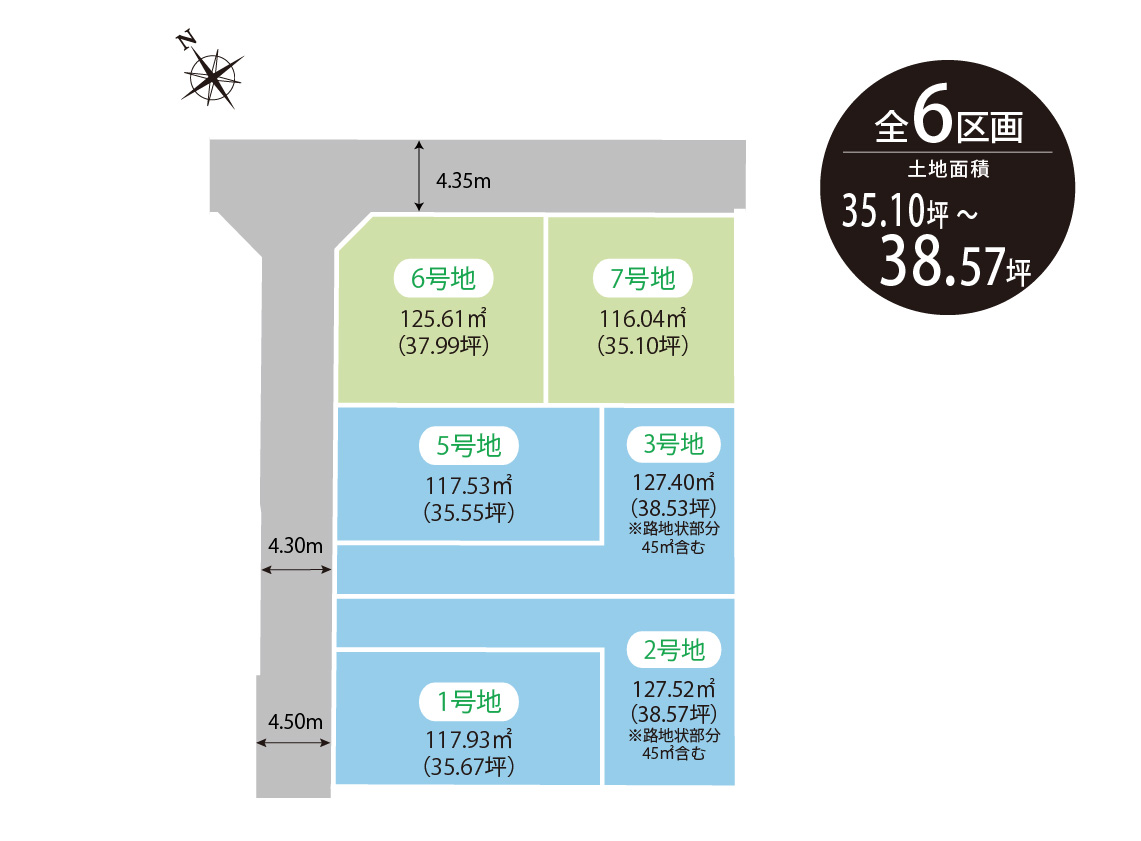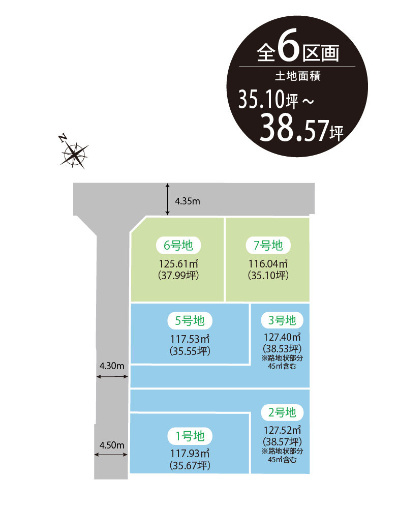 | 土地面積 | 117.93m2(35.67坪)~127.52m2(38.57坪)※路地状部分45㎡含む |