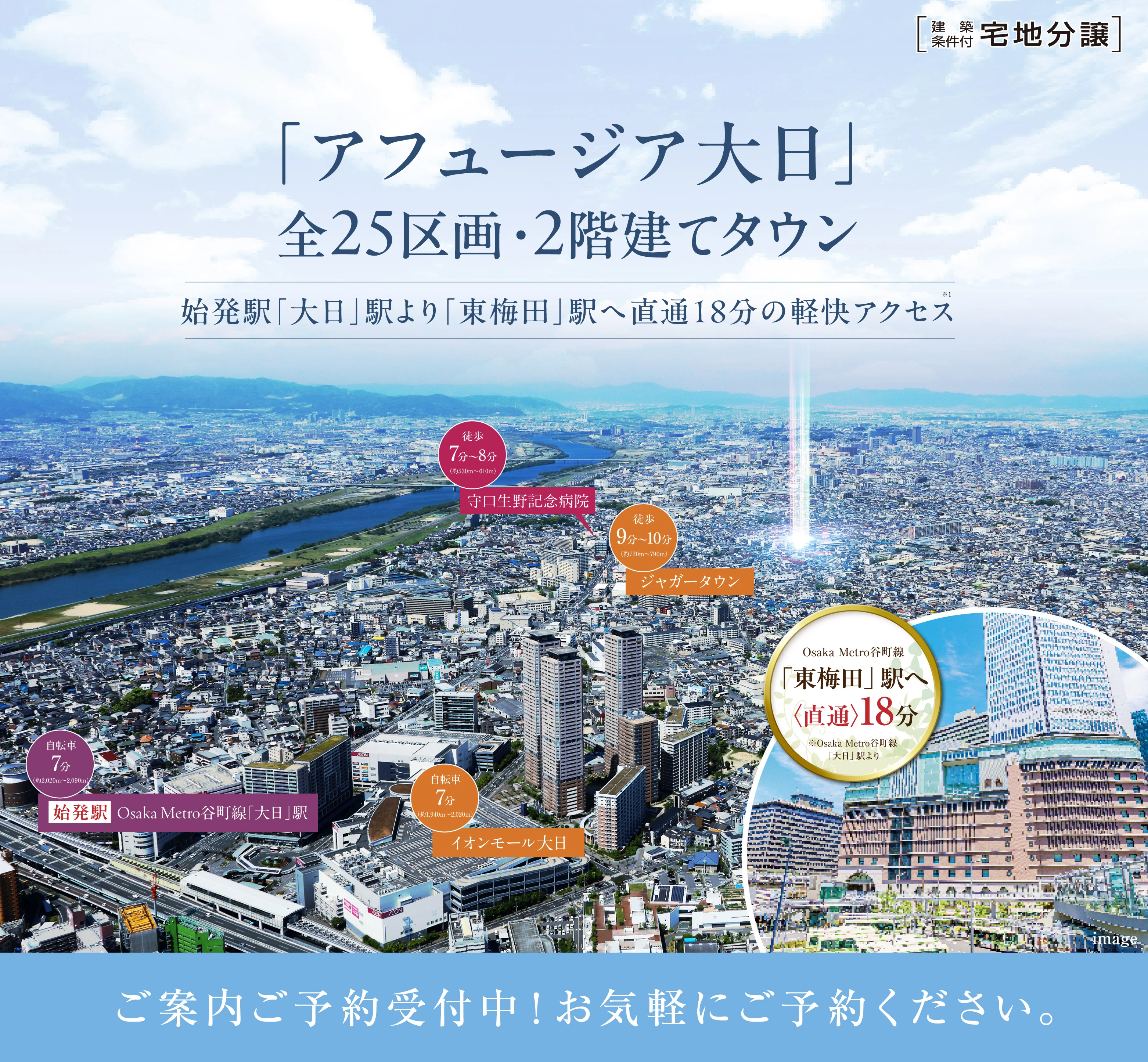 物件名称 アフュージア大日 所在地 大阪府守口市金田町3丁目224番地1を分筆する土地 交通 OsakaMetro谷町線「大日」駅まで 徒歩26分~27分