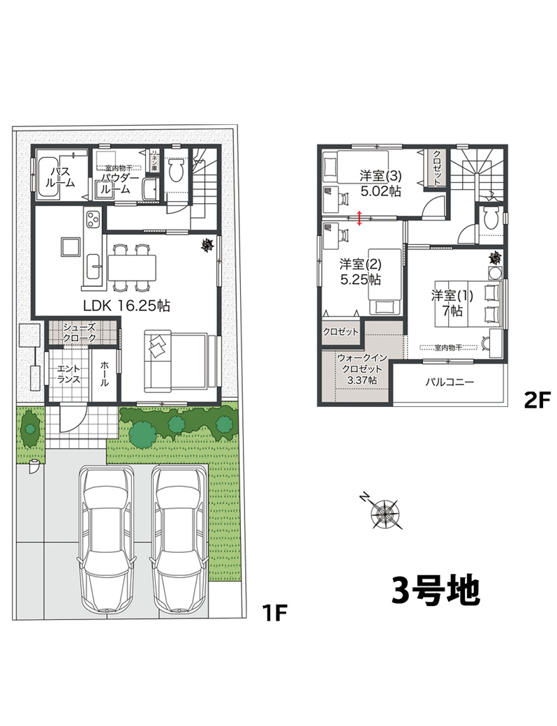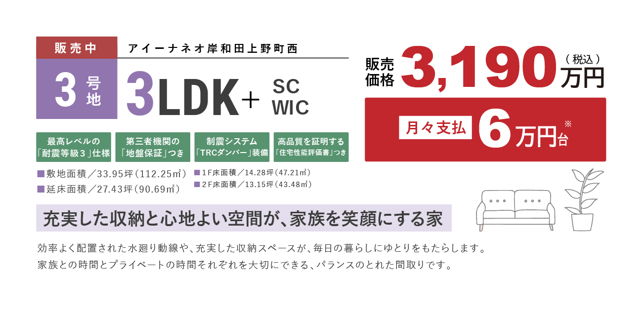 販売戸数 3 戸 販売価格 3,130万円~3,490万円 外構・付帯工事費 販売価格に含む 間取り 1号地・2号地:3LDK+SC+WIC+FC、3号地:3LDK+SC+WIC 建物面積 90.69m2(27.43坪)~100.63m2(30.44坪) 土地面積 105.57m2(31.93坪)~118.79m2(35.93坪) 建築確認番号 1号地:R07確認建築近確0000800号(2025年7月23日)、2号地:R07確認建築近確0000802号(2025年7月23日)、3号地:R07確認建築近確0000803号(2025年7月23日) 販売スケジュール 先着順 取引条件の有効期限 2025年12月9日 入居時期 完成後3ヶ月 構造・規模 木造2階建て 完成時期(築年月) 1号地・2号地:2025年12月、3号地:2026年2月 売主 フジ住宅株式会社 問い合わせ 0120-24-0413 ※諸費用/自治会費、登記費用、並びに住宅ローンご利用の方は利用するローンの規定と利用形態に応じた保証料・事務手数料及び火災保険料等が必要になります。 ※先着順につき、契約済の場合がございます。あらかじめご了承ください。 ※WIC=ウォークインクロゼット、SC=シューズクローク、FC=ファミリークロゼット