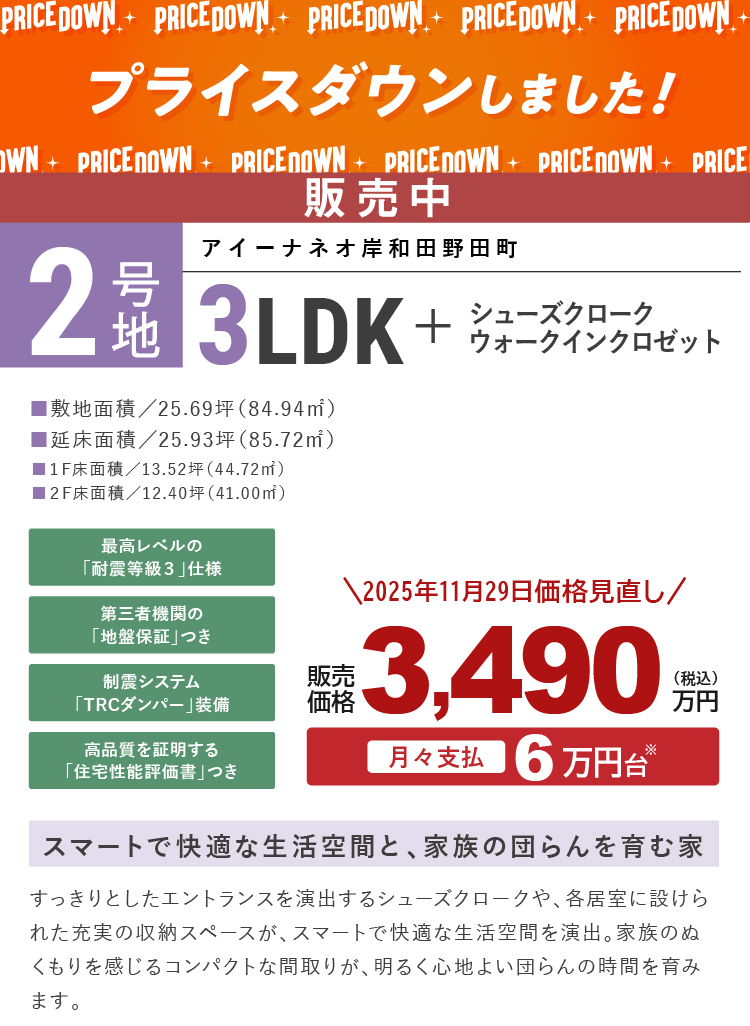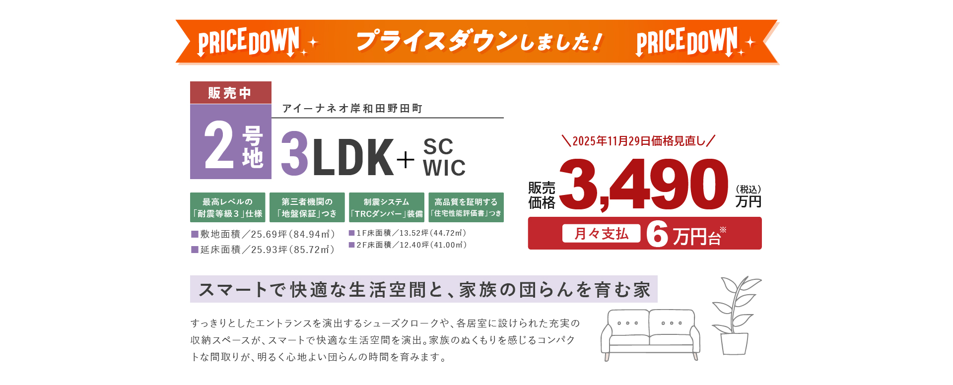 - NEW 【 アイーナネオ岸和田野田町】2号地プライスダウンしました!