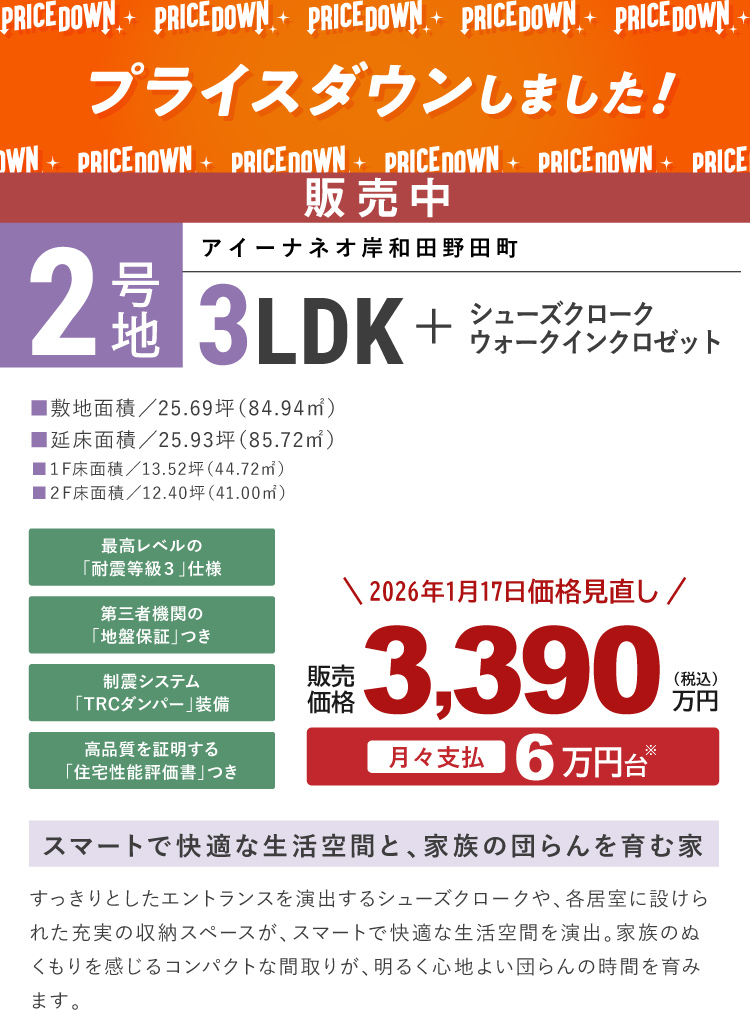 - 【 アイーナネオ岸和田野田町】2号地プライスダウンしました!