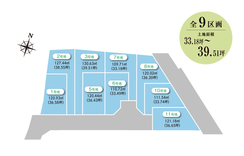 総区画数 9 区画 用途地域 第一種住居地域 地目 宅地 建ペイ率 60% 容積率 200% 電気・ガス 関西電力・都市ガス 水道・排水 公営水道・公共下水道 道路幅員 17.96m(南側市道) 5.7m(開発道路) 5.94m(北東側 非該当) 2.7m(西側 未判定) 私道負担 なし 開発面積 1420.49m2 造成完了時期 2025年8月完了済み 宅地面積 109.71㎡ (33.18坪) ~ 130.63㎡ (39.51坪) その他 準防火地域 売主 フジ住宅株式会社