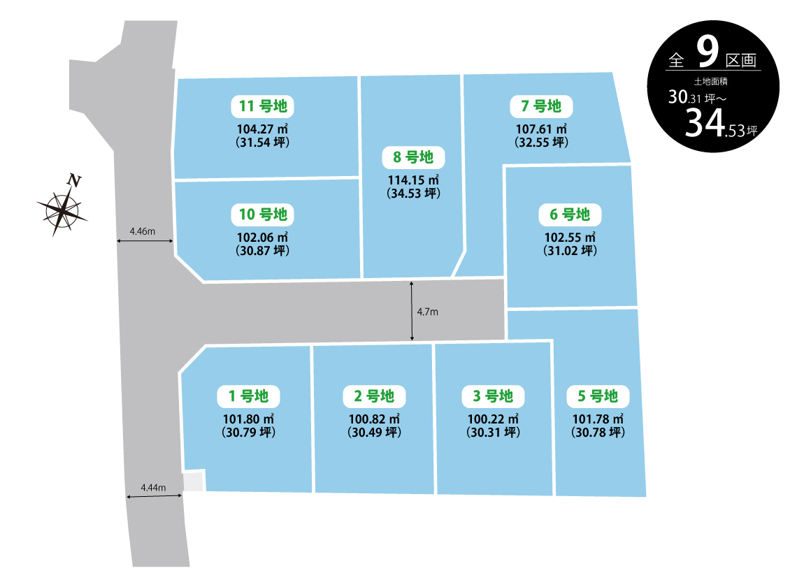 総区画数 9 区画 (1期:3区画、2期:6区画) 用途地域 第一種中高層住居専用地域 地目 宅地 建ペイ率 60%・70% 容積率 188% 電気・ガス 関西電力・都市ガス 水道・排水 公営水道・公共下水道 道路幅員 4.7m(位置指定道路)、4.44m~4.46m(南西側市道) 私道負担 私道負担無し 開発面積 444.21㎡(1期3区画)、611.72㎡(2期6区画) 開発許可番号 位置指定道路につき開発許可番号不要 造成完了時期 1期:2025年10月、2期:2026年2月 宅地面積 100.22m2(30.31坪)~114.15m2(34.53坪) その他 準防火地域、第2種高度地区、岸和田市景観計画、宅地造成及び特定盛土等規制法、道路の位置指定番号:岸和田市第7-002号(2025年9月1日) 売主 フジ住宅株式会社