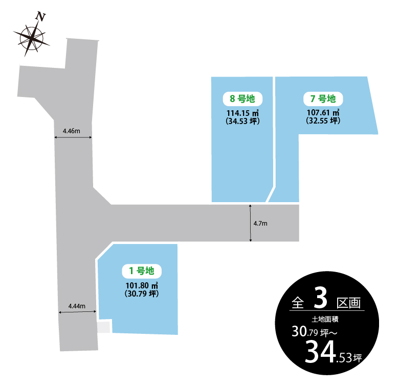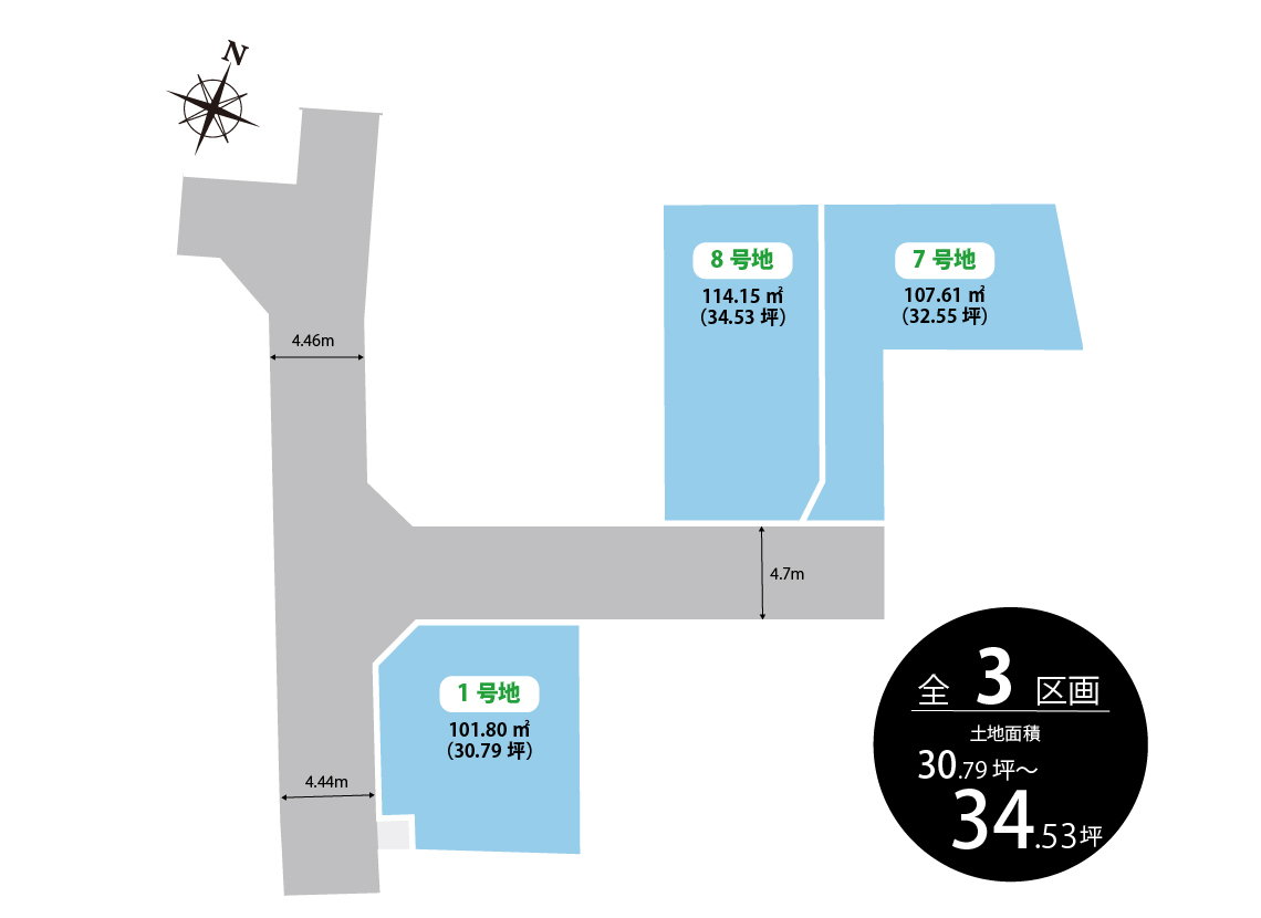 総区画数 3 区画 用途地域 第一種中高層住居専用地域 地目 宅地 建ペイ率 60%・70% 容積率 188% 電気・ガス 関西電力・都市ガス 水道・排水 公営水道・公共下水道 道路幅員 4.7m(位置指定道路)、4.44m~4.46m(南西側市道) 私道負担 私道負担無し 開発面積 444.21㎡ 造成完了時期 2025年10月 宅地面積 101.80m2(30.79坪)~114.15m2(34.53坪) その他 準防火地域、第2種高度地区、岸和田市景観計画、宅地造成及び特定盛土等規制法 売主 フジ住宅株式会社