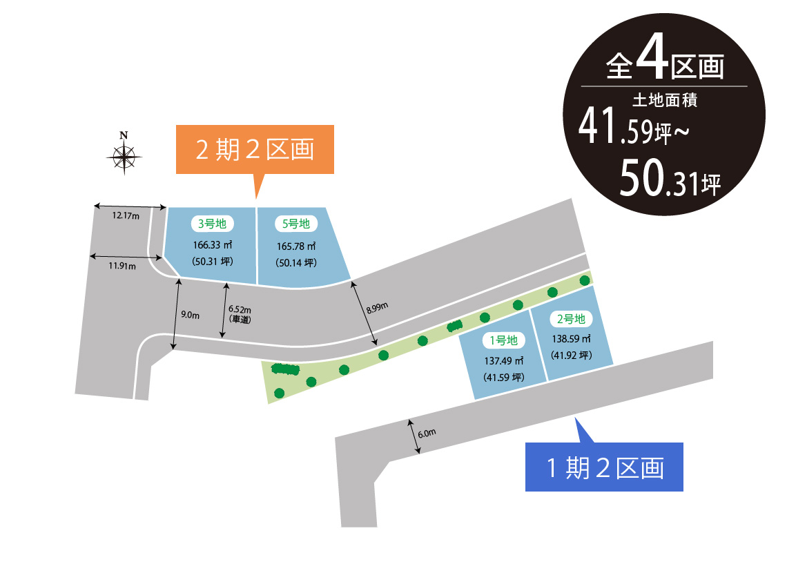 全戸南向き|土地面積41坪超|道路幅員最大約12m