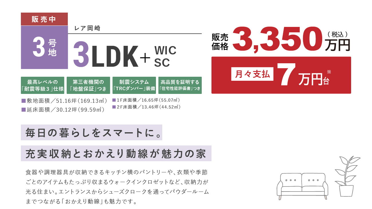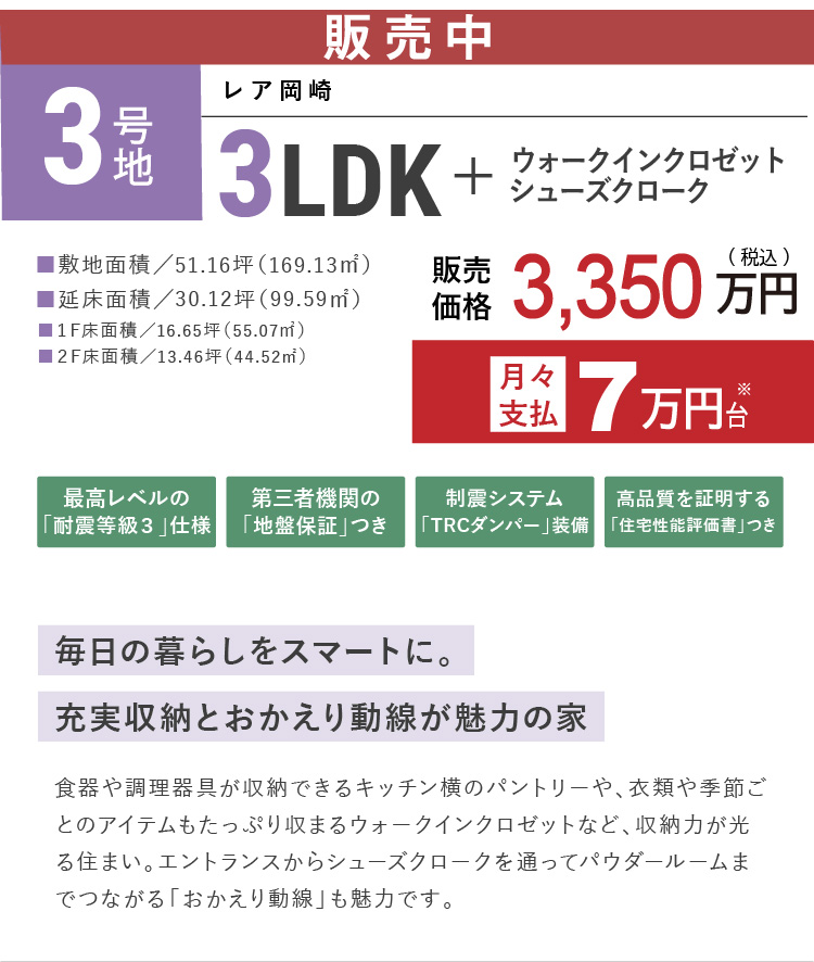 区画名称 レア岡崎3号地 販売戸数 1 戸 販売価格 3,350万円 外構・付帯工事費 販売価格に含む 間取り 3LDK+WIC+SC 建物面積 99.59㎡ (30.12坪) 土地面積 169.13㎡ (51.16坪) 建築確認番号 第R07確認建築近確0001478号(2025年9月4日) 販売スケジュール 先着順 入居時期 2026年6月以降 構造・規模 木造(在来軸組工法) 完成時期(築年月) 2026年2月 取引条件の有効期限 2025年12月2日 売主 フジ住宅株式会社 問い合わせ 0120-24-0413 ※諸費用/自治会費、登記費用、並びに住宅ローンご利用の方は利用するローンの規定と利用形態に応じた保証料・事務手数料及び火災保険料等が必要になります。 ※先着順につき、契約済の場合がございます。あらかじめご了承ください。 ※販売価格には、消費税(10%)相当額が含まれます。
