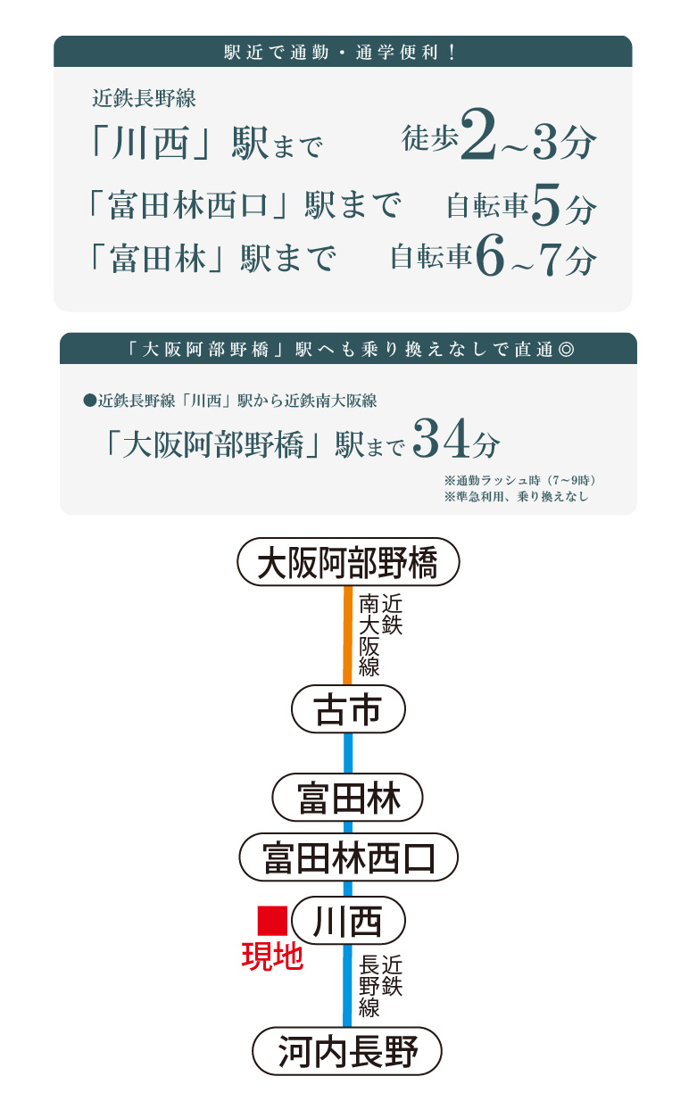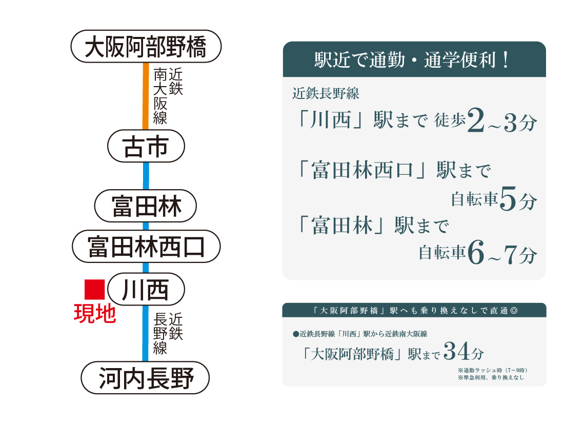 近鉄長野線「川西」駅まで徒歩2分~3分、「富田林西口」駅まで徒歩16分~17分、「富田林」駅まで徒歩23分 |