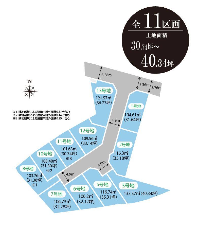 総区画数 11 区画 用途地域 第二種中高層住居専用地域 地目 宅地 建ペイ率 60%・70% 容積率 196%・200% 電気・ガス 関西電力・都市ガス 水道・排水 公営水道・公共下水道 道路幅員 5.36m~5.76m(北側市道)、4.9m(開発道路)、現況:3.91m~4.58m、基準法上:4.45m(南東側市道) 私道負担 無し 開発面積 2,333.64㎡(共同住宅1棟含む) 開発許可番号 富田林市指令広まち第11-3号(2025年6月23日) 造成完了時期 2025年12月 宅地面積 101.33m2(30.74坪)~133.37m2(40.34坪) その他1 準防火地域、文化財保護法(新家遺跡)、宅地造成及び特定盛土等規制法、大阪府景観計画(届出対象外) その他2 ※7号地の南西角の上空の一部に電柱の支線がかかっています。※行政の指導により敷地の10%以上の緑被率が必要です。※8,10,11号地の北西側隣地との境界付近において、隣地のブロック等が本物件側へ約4~150mm越境しており、前所有者にて将来撤去の覚書を取得済です。(敷地に含まれる隣地越境による建確申請外面積/8号地:0.37㎡、10号地:0.44㎡、11号地:0.30㎡) 売主 〔本社〕〒596-8588 大阪府岸和田市土生町1丁目4番23号