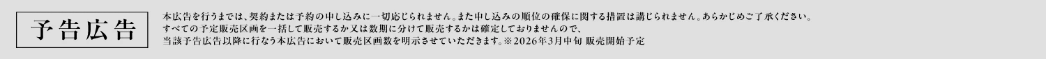 区画名称 (建築条件付宅地)分譲概要 販売区画数 未定 土地面積 未定 土地価格 未定 最多価格帯 未定 販売スケジュール 2026年3月中旬販売開始予定 取引条件有効期限 2026年3月末日 売主 フジ住宅株式会社 問い合わせ 0120-00-0022 ※現在造成工事中に付き、販売土地面積が多少増減する場合があります。あらかじめご了承下さい。 ※自由設計について、当社の定める構造及び仕様の範囲内で自由に設計できますが、一部お客様のご要望にお応え出来ない場合がありますので、あらかじめご了承ください。 ※この土地は土地売買契約後3ヶ月以内に当社と建築請負契約をむすんで頂くことを停止条件として販売します。この期間内に建築請負契約が成立しない場合は、売買契約はなかったことになり申し込み金その他お預かりした金員は全額無条件にて返還します。 ※シンボルツリーにつきましては、お引渡し後に当社指定業者と打ち合わせをしていただき、植栽箇所を決めていただきます。ご契約者様のご要望によりシンボルツリーを設けない区画が生じることがあります。尚、シンボルツリーをご希望されない場合でも、返金等には応じかねますのでご了承ください。 ※諸費用/自治会費、登記費用、並びに住宅ローンご利用の方は利用するローンの規定と利用形態に応じた保証料・事務手数料及び火災保険料等が必要になります。 ※【予告広告】販売を開始するまでは、契約または予約のお申込みはできません。また、申込順位の確保に関する措置を講じる事はできません。予めご了承ください。すべての予定販売区画を一括して販売するか又は数期に分けて販売するかは確定しておりませんので、当該予告広告以降に行なう本広告において販売区画数を明示させていただきます。情報更新日