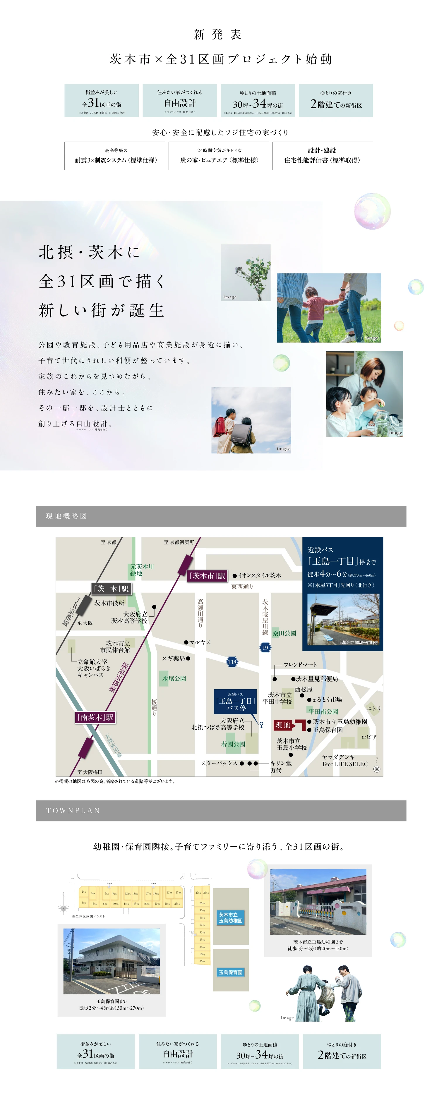物件名称 (仮称)茨木市|全31区画|幼稚園隣接のビッグタウンプロジェクト 所在地 A街区:大阪府茨木市平田2丁目190番1と190番3を合筆して分筆する土地(地番)、B街区:大阪府茨木市平田2丁目200番他(地番) 交通 阪急京都線「茨木市」駅までバス12分、近鉄バス「玉島一丁目」停まで徒歩4分~6分