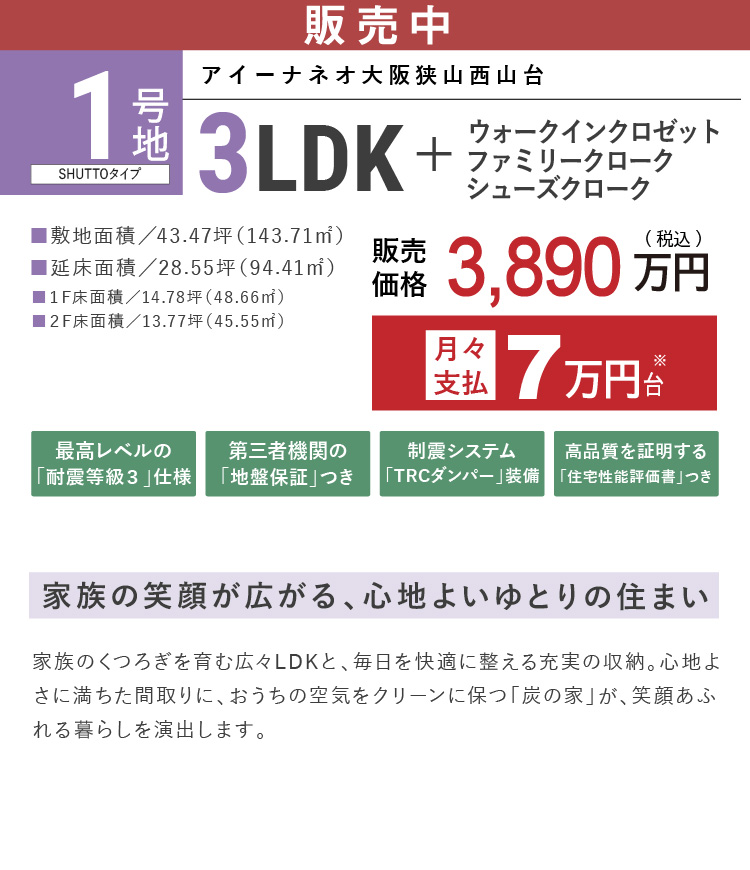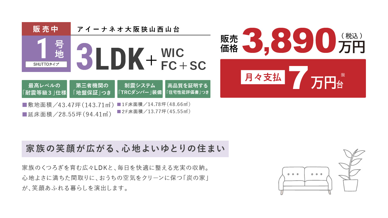 区画名称 アイーナネオ大阪狭山西山台 1号地 販売戸数 1 戸 販売価格 3,890万円(税込) 外構・付帯工事費 販売価格に含む 間取り 3LDK+SC+FC+WIC 建物面積 94.41m2(28.55坪) 土地面積 143.71m2(43.47坪) 建物竣工時期 2025年10月 建築確認番号 R07確認建築近確0000513号(2025年6月4日) 販売スケジュール 先着順 入居時期 契約後3ヶ月 構造・規模 木造(在来軸組工法) 取引条件の有効期限 2025年12月16日 売主 フジ住宅株式会社 問い合わせ 0120-24-0413 ※諸費用/自治会費、登記費用、並びに住宅ローンご利用の方は利用するローンの規定と利用形態に応じた保証料・事務手数料及び火災保険料等が必要になります。 ※先着順につき、契約済の場合がございます。あらかじめご了承ください。 ※販売価格には、消費税(10%)相当額が含まれます。