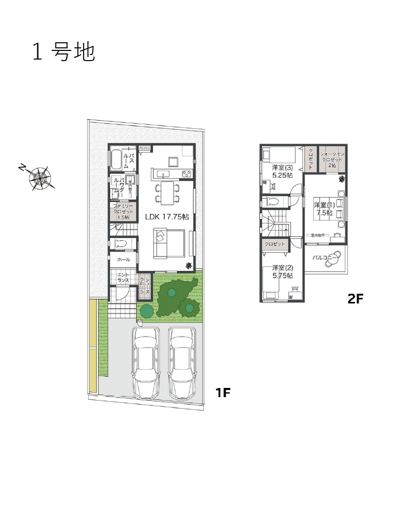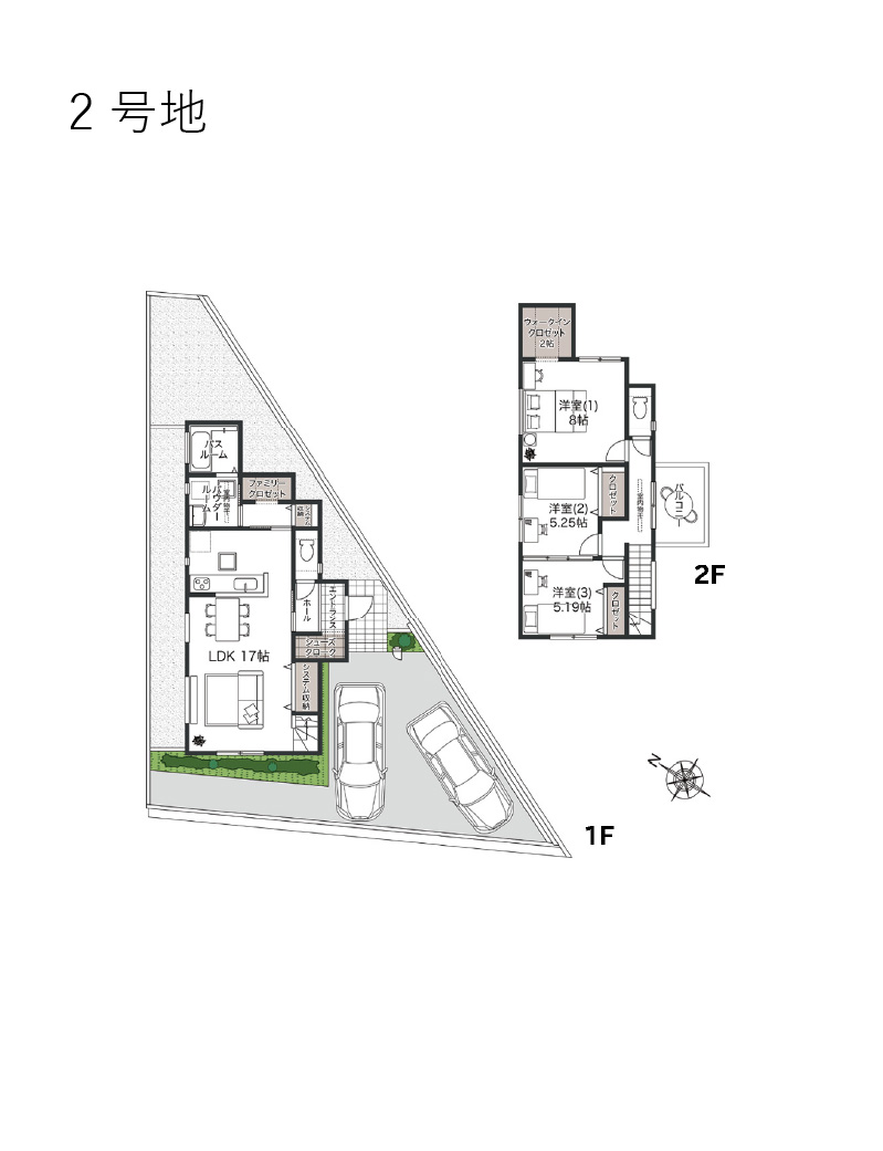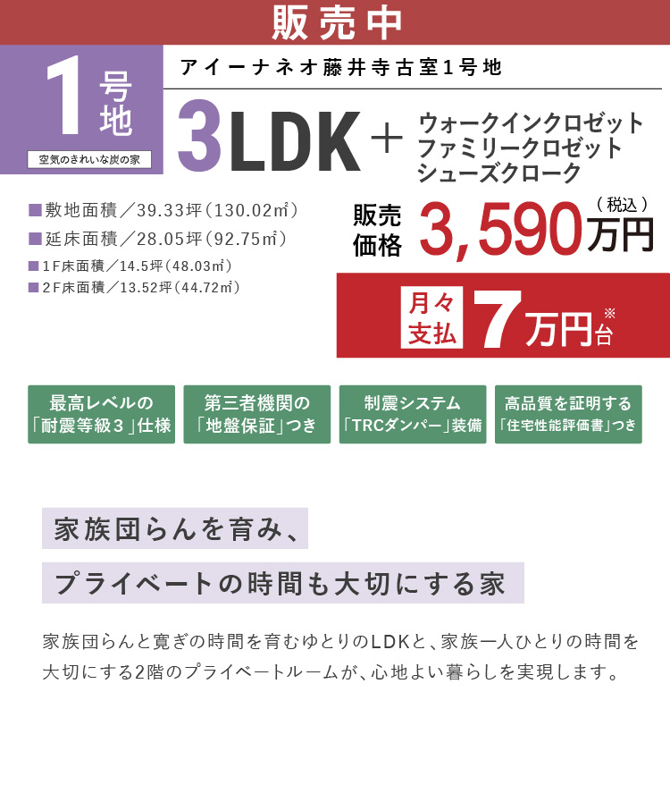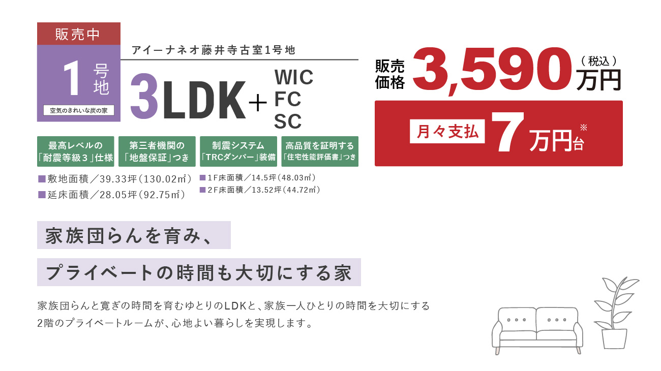 販売戸数 2 戸 販売価格 1号地:3,590万円(税込)2号地:3,790万円(税込) 外構・付帯工事費 販売価格に含む 間取り 1号地:3LDK+SC+FC+WIC2号地:3LDK+SC+FC+WIC 建物面積 1号地:92.75m2(28.05坪)