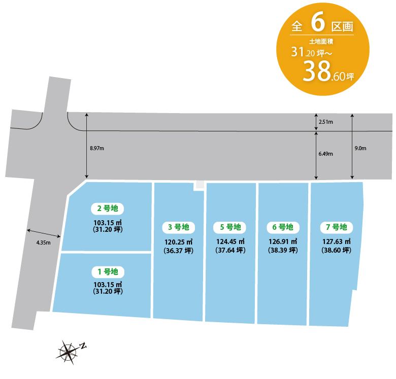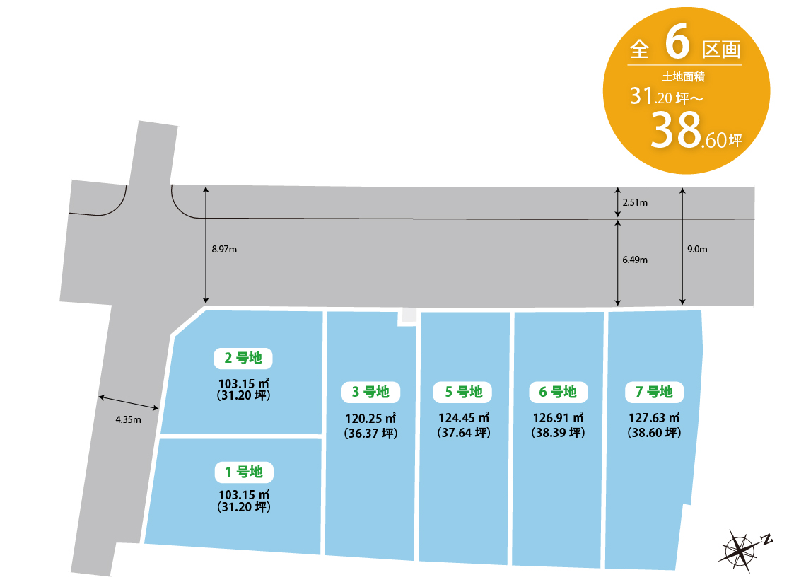 総区画数 6 区画 用途地域 第一種住居地域(1,2号地の一部)、準工業地域(1,2号地の一部、3~7号地) 地目 宅地 建ペイ率 60%・70% 容積率 193%・200% 電気・ガス 関西電力・都市ガス 水道・排水 公営水道・公共下水道 道路幅員 8.97m~9.0m(西側市道)4.35m(南側市道) 私道負担 私道負担無し 開発面積 738.44㎡ 開発許可番号 貝塚市指令貝まち第252-2号(2025年5月20日) 造成完了時期 2025年10月 宅地面積 103.15m2(31.20坪)~127.63m2(38.60坪) その他 文化財保護法(加治・神前・畠中遺跡)、宅地造成及び特定盛土等規制法、貝塚市景観計画(届出対象外) 売主 フジ住宅株式会社
