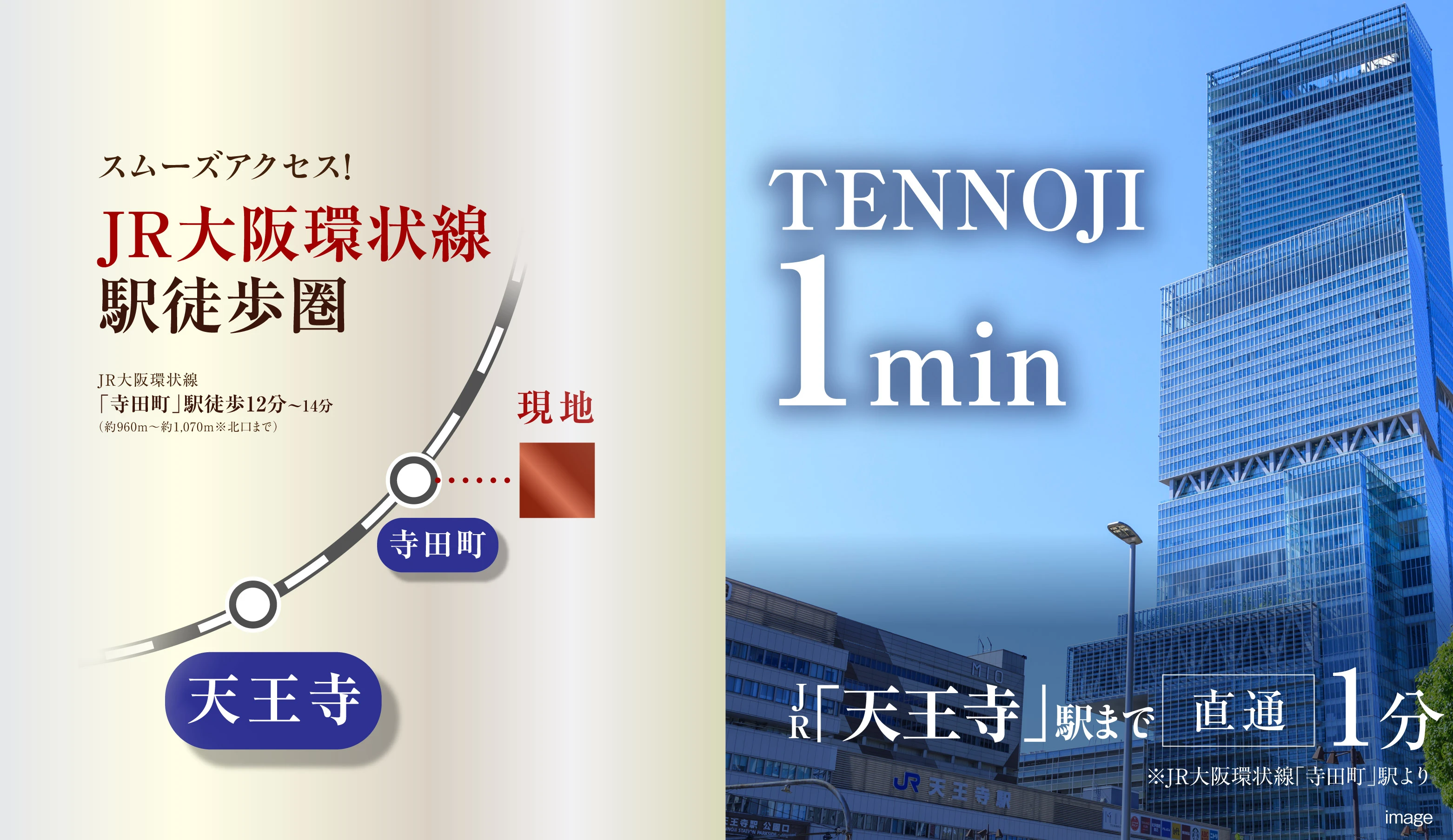 JR大阪環状線「寺田町」駅まで徒歩12分~14分(約960m~約1,070m)※北口まで JR大和路線「東部市場前」駅まで徒歩14分~16分(約1,100m~約1,220m)※南口まで 近鉄南大阪線「河堀口」駅まで徒歩17分~18分(約1,330m~約1,440m)※北出口まで JR大阪環状線「天王寺」駅まで自転車8分(約2,230m~約2,320m)※東口まで 大阪メトロ千日前線「南巽」駅まで自転車8分(約2,170m~約2,260m)※2番出入り口まで