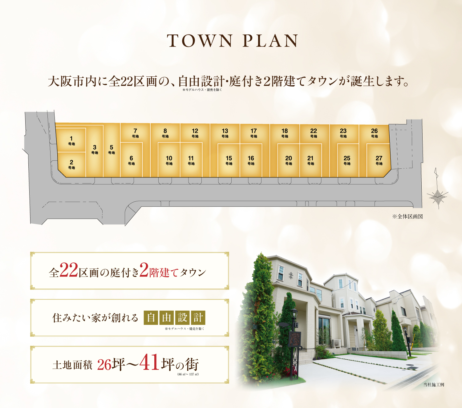 (公社)近畿地区不動産公正取引協議会加盟問い合わせ 0120-00-0022 ※現在造成工事中に付き、販売土地面積が多少増減する場合があります。あらかじめご了承下さい。 ※自由設計について、当社の定める構造及び仕様の範囲内で自由に設計できますが、一部お客様のご要望にお応え出来ない場合がありますので、あらかじめご了承ください。 ※この土地は土地売買契約後3ヶ月以内に当社と建築請負契約をむすんで頂くことを停止条件として販売します。この期間内に建築請負契約が成立しない場合は、売買契約はなかったことになり申し込み金その他お預かりした金員は全額無条件にて返還します。 ※シンボルツリーにつきましては、お引渡し後に当社指定業者と打ち合わせをしていただき、植栽箇所を決めていただきます。ご契約者様のご要望によりシンボルツリーを設けない区画が生じることがあります。尚、シンボルツリーをご希望されない場合でも、返金等には応じかねますのでご了承ください。 ※諸費用/自治会費、登記費用、並びに住宅ローンご利用の方は利用するローンの規定と利用形態に応じた保証料・事務手数料及び火災保険料等が必要になります。情報更新日