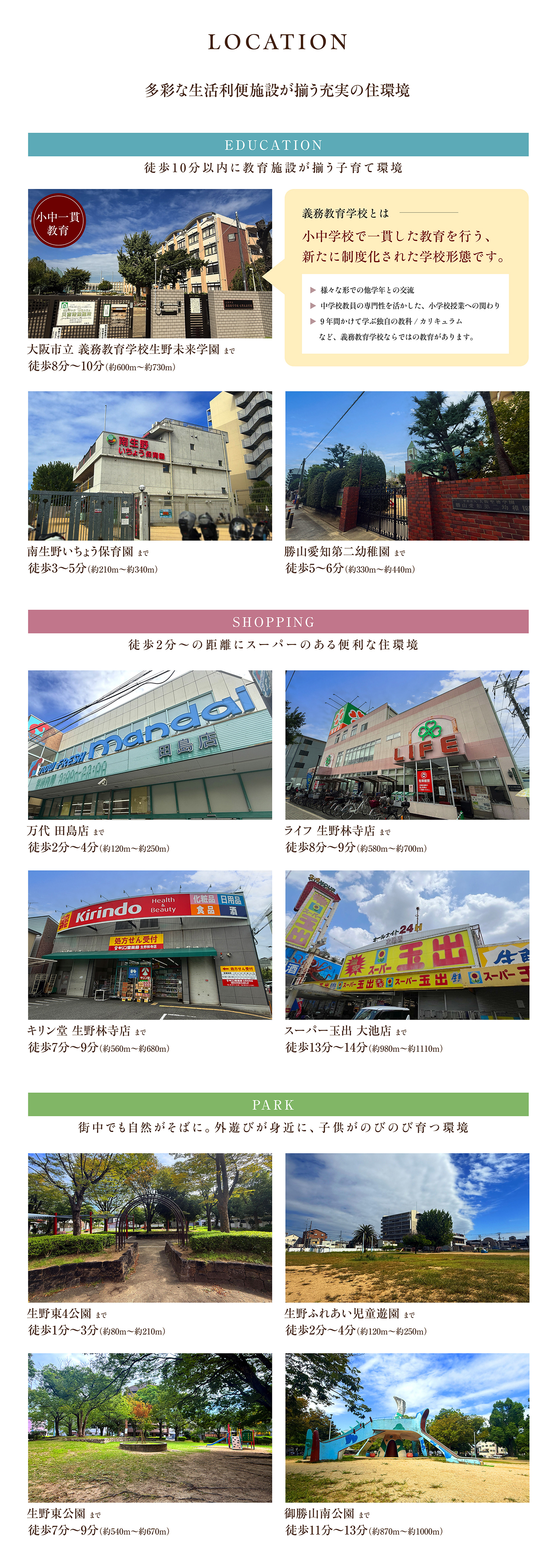 大阪市立義務教育学校生野未来学園まで徒歩8分~10分(約600m~約730m) 南生野いちょう保育園まで徒歩3分~5分(約210m~約340m) 勝山愛知第二幼稚園まで徒歩5分~6分(約330m~約440m) 林寺保育園まで徒歩6分~8分(約450m~約570m) 聖浄保育園まで徒歩7分~9分(約550m~約680m) 勝山愛知第三幼稚園まで徒歩8分~9分(約580m~約710m) 高松保育園まで徒歩9分~10分(約660m~約770m) 生野幼児園まで徒歩9分~11分(約680m~約810m) まつもとかえでの保育園まで徒歩9分~11分(約690m~約820m) リソーマ保育園まで徒歩10分~11分(約730m~約840m) すみれ幼稚園まで徒歩10分~11分(約750m~約870m) エンジェルキッズ阿倍野園まで徒歩11分~13分(約870m~約980m) 生野保育所まで徒歩11分~13分(約880m~約1,010m) 日の出巽西園まで徒歩16分~17分(約1,210m~約1,330m) 一条通り保育園まで徒歩16分~18分(約1,280m~約1,410m)