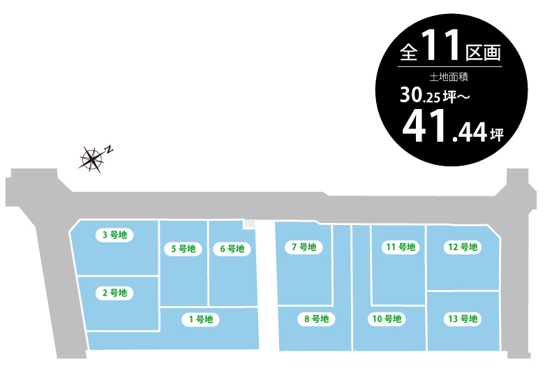 ※掲載の全体区画図イメージイラストは図面を基に描き起こしたもので、イメージにつき実際とは異なります。また、行政の指導等により変更となる場合がございます。フェンス等は一部省略しております。 ※現在造成工事中に付き、販売土地面積が多少増減する場合があります。あらかじめご了承下さい。