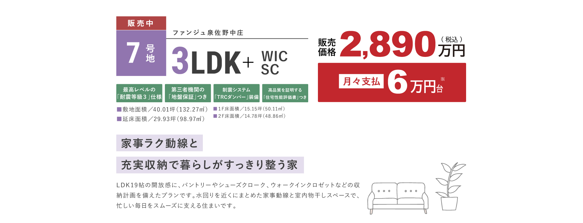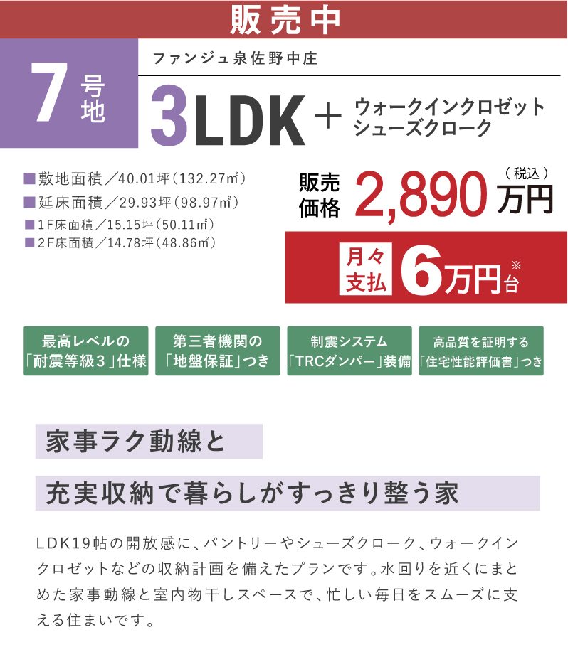 区画名称 ファンジュ泉佐野中庄 7号地 販売戸数 1 戸 販売価格 2,890万円 外構・付帯工事費 販売価格に含む 間取り 3LDK+WIC+SC 建物面積 98.97㎡ (29.93坪) 土地面積 132.27㎡ (40.01坪) 完成時期(築年月) 2026年4月 建築確認番号 第R07確認建築近確0001792号(2025年9月22日) 販売スケジュール 先着順 入居時期 2026年8月以降 構造・規模 木造(在来軸組工法) 取引条件の有効期限 2026年2月11日 売主 フジ住宅株式会社 問い合わせ 0120-24-0413 ※諸費用/自治会費、登記費用、並びに住宅ローンご利用の方は利用するローンの規定と利用形態に応じた保証料・事務手数料及び火災保険料等が必要になります。 ※先着順につき、契約済の場合がございます。あらかじめご了承ください。 ※販売価格には、消費税(10%)相当額が含まれます。