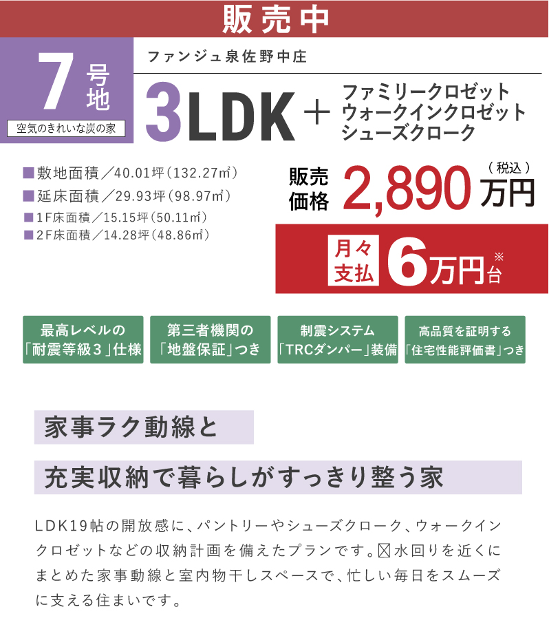 区画名称 ファンジュ泉佐野中庄 7号地 販売戸数 1 戸 販売価格 2,890万円 外構・付帯工事費 販売価格に含む 間取り 3LDK+WIC+SC 完成時期(築年月) 2026年4月 建築確認番号 第R07確認建築近確0001792号(2025年9月22日) 販売スケジュール 先着順 入居時期 2026年8月以降 構造・規模 木造(在来軸組工法) 取引条件の有効期限 2026年1月20日 売主 フジ住宅株式会社 問い合わせ 0120-24-0413 ※諸費用/自治会費、登記費用、並びに住宅ローンご利用の方は利用するローンの規定と利用形態に応じた保証料・事務手数料及び火災保険料等が必要になります。 ※先着順につき、契約済の場合がございます。あらかじめご了承ください。 ※販売価格には、消費税(10%)相当額が含まれます。