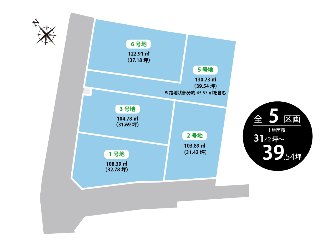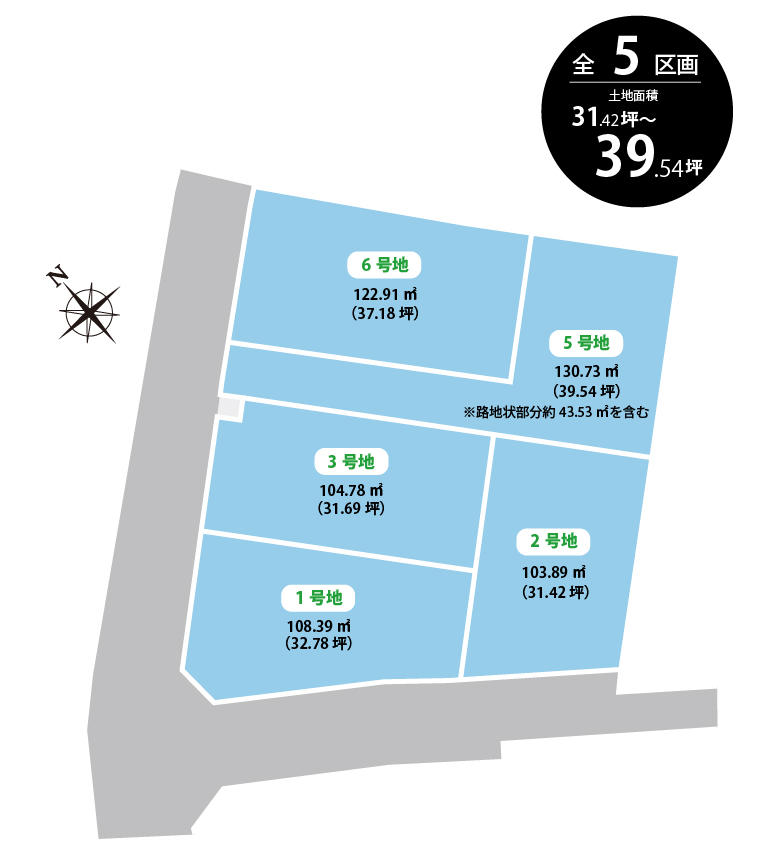 ※掲載の外観・内観写真はすべて当社施工例です。標準仕様とは異なるオプションを含みます。 ※39.54坪(5号地)は路地状部分約43.53㎡を含みます。