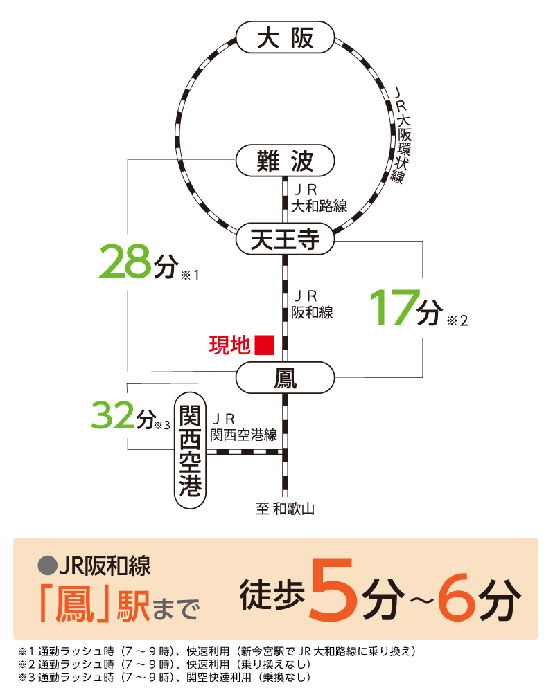 最寄り駅のJR阪和線「鳳」駅まで徒歩5分~6分。大阪の都心部「天王寺」は乗り換えなしのダイレクトアクセス