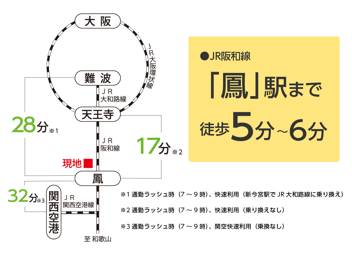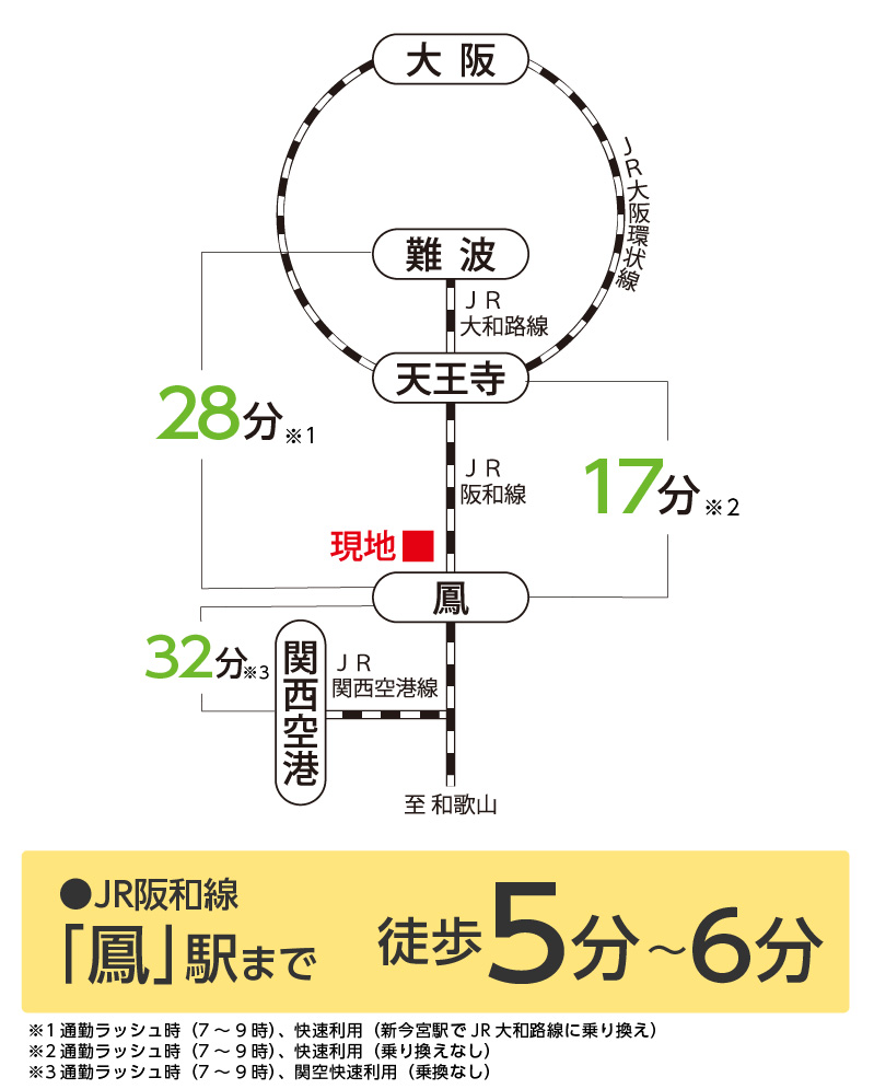 最寄り駅のJR阪和線「鳳」駅まで徒歩5分~6分。大阪の都心部「天王寺」は乗り換えなしのダイレクトアクセス