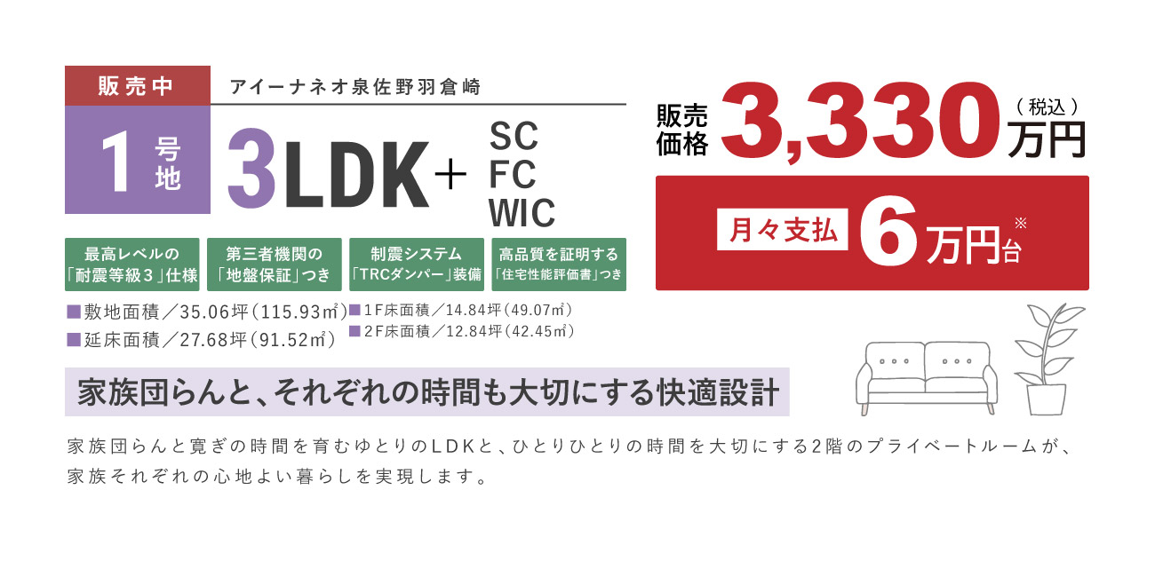 ※40年返済での計算です。※当社提携銀行ローン0.87%/3,330万円の物件を頭金0円で3,330万円借入れの場合※月々返済/65,638円※ボーナス返済(年2回)/約10.0万円(1回分)※当社提携銀行ローン 年0.87%(変動金利)元利均等払い・現行金利3.075%から-2.205%優遇金利を適用した場合の計算例です。※金利は変更される場合があります。※融資限度額/購入価格が融資限度額(100万円以上2億円以内・10万円単位)。※融資限度額の割合/物件価格の最高110%以内(各金融機関による)。※銀行融資手数料/お借入金額 ×~2.2%(各金融機関による)。※金融機関事務手数料/66,000円(各金融機関による)。※団体信用生命保険/加入要。※当社事務手数料/110,000円(税込)。※上記金利は2025年10月1日時点のものです。上記金利は一定の条件を満たす方の例です。※販売価格には消費税(10%)相当額が含まれます。※販売価格には外構・付帯工事費が含まれます。※諸費用/自治会費、登記費用、並びに住宅ローンご利用の方は利用するローンの規定と利用形態に応じた保証料・事務手数料及び火災保険料等が必要になります。※間取図・外構等は図面を基に描いたイメージにつき、実際とは一部異なる場合があります。(2025年10月時点)※間取図の家具・車の表記はイメージ配置になり、実際には付きません。 ※FC=ファミリークロゼット、WIC=ウォークインクロゼット、SC=シューズクローク。※「住宅ローン減税」について詳しくはこちらのサイトをご確認ください。※「BELS」について詳しくはこちらのサイトをご確認ください。