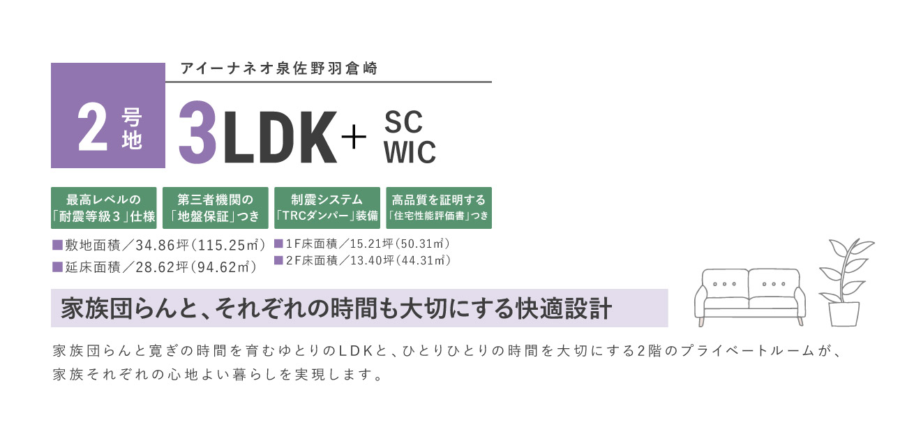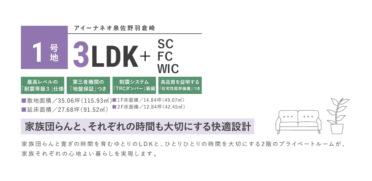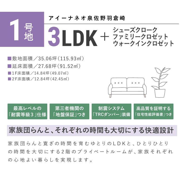 区画名称 アイーナネオ泉佐野羽倉崎 販売戸数 2 戸 販売価格 1号地:3,330万円(税込)2号地:3,290万円(税込) 建物面積 1号地:91.52m2(27.68坪)2号地:94.62m2(28.62坪) 土地面積 1号地:115.93m2(35.06坪)2号地:115.25m2(34.86坪) 完成時期(築年月) 2026年1月 建築確認番号 1号地:R07確認建築近確0001685号 2025年9月9日2号地:R07確認建築近確0001684号 2025年9月11日 販売スケジュール 先着順 入居時期 建物完成後3ヵ月 構造・規模 木造2階建て 取引条件の有効期限 2025年12月2日 ※諸費用/自治会費、登記費用、並びに住宅ローンご利用の方は利用するローンの規定と利用形態に応じた保証料・事務手数料及び火災保険料等が必要になります。 ※先着順につき、契約済の場合がございます。あらかじめご了承ください。 ※外構・付帯工事費には、消費税(10%)相当額が含まれます。