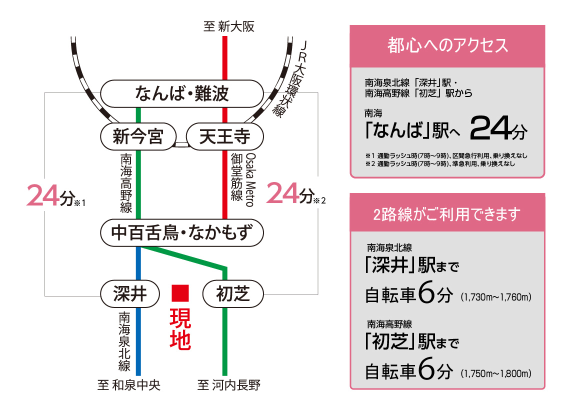 南海泉北線「深井」駅 自転車6分(1730m~1760m) 南海高野線「初芝」駅 自転車6分(1750m~1800m)