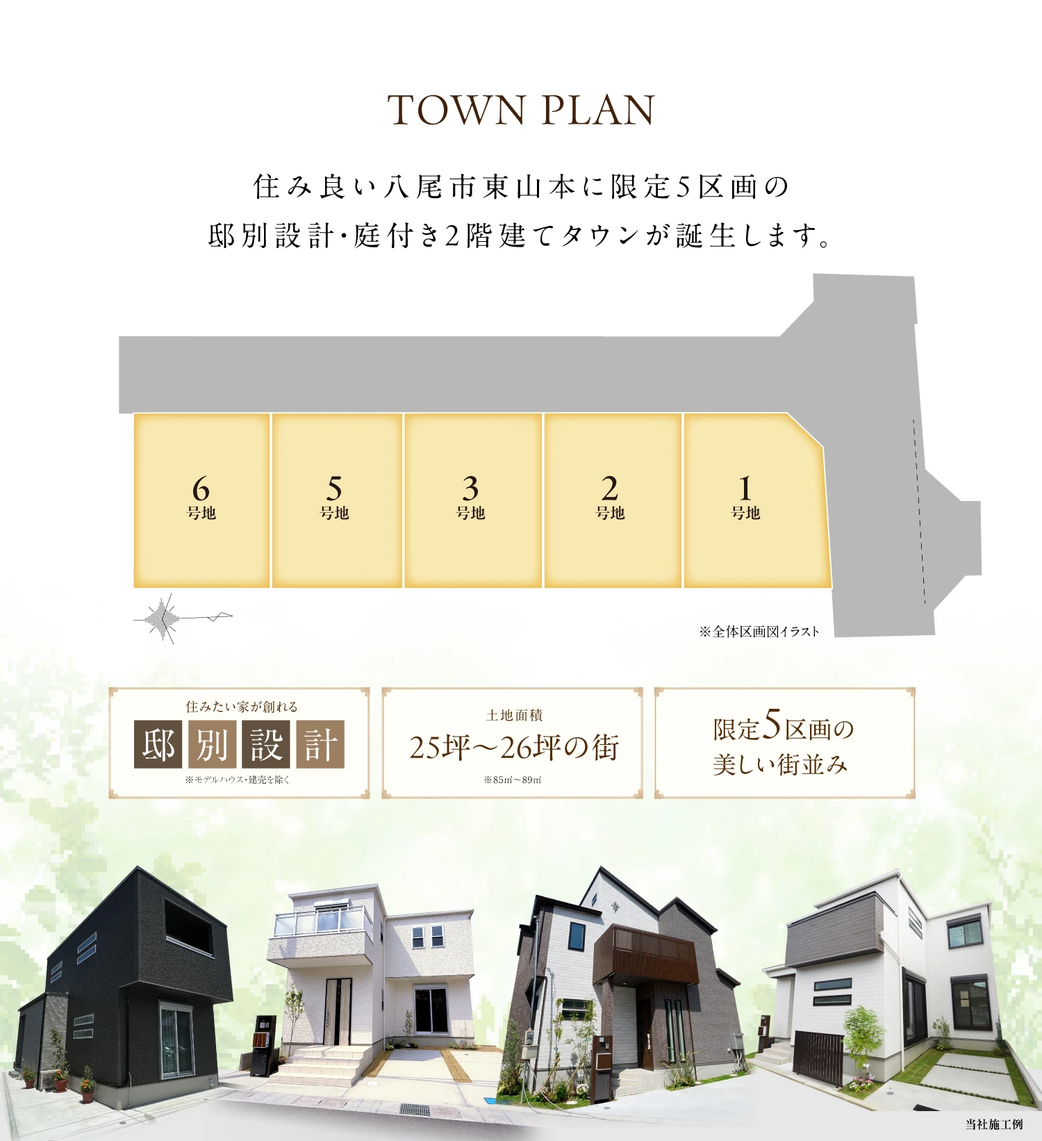 総区画数 5区画 区画 (モデルハウス・建売含む) 用途地域 第二種中高層住居専用地域 地目 田(引渡までに宅地に変更予定) 建ペイ率 60%・70% 容積率 188%・200% 設備概要 電気:関西電力、ガス:都市ガス、水道:公営水道、下水:公共下水 道路幅員 北側市道(認定幅員)5.62m、西側市道4.7m 私道負担 なし 開発許可番号 なし 開発面積 446.25㎡ 造成完了時期 2026年8月中旬予定 土地面積 85㎡~89㎡ その他法令 準防火地域、第2種高度地区、景観法、宅地造成及び特定盛土等規制法、特定都市河川浸水対策法、航空法、居住誘導区域、八尾市開発指導要綱 売主 フジ住宅株式会社
